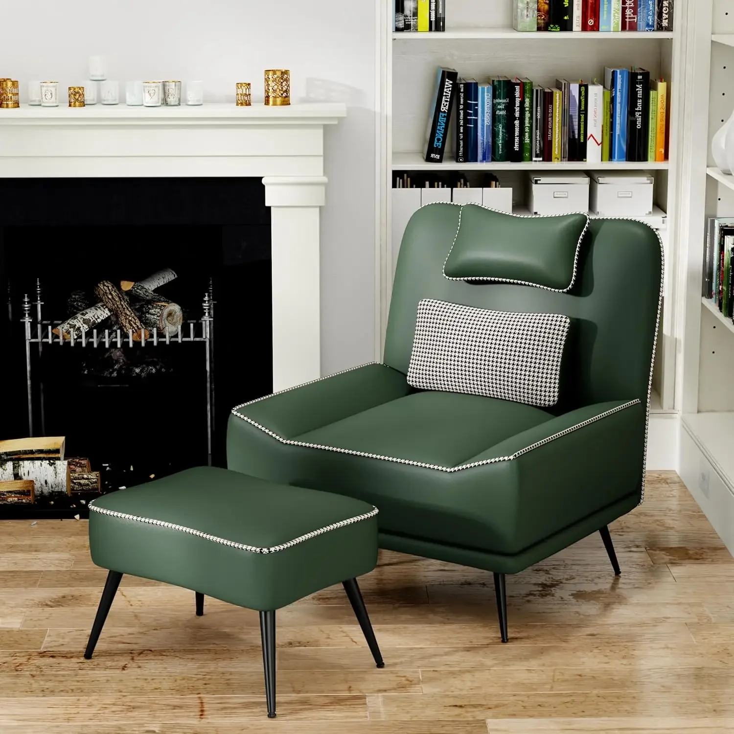 Accent Chair with Ottoman, Mid Century Modern Upholstered Faux Leather Chairs for Living Room Bedroom Lounge Chair