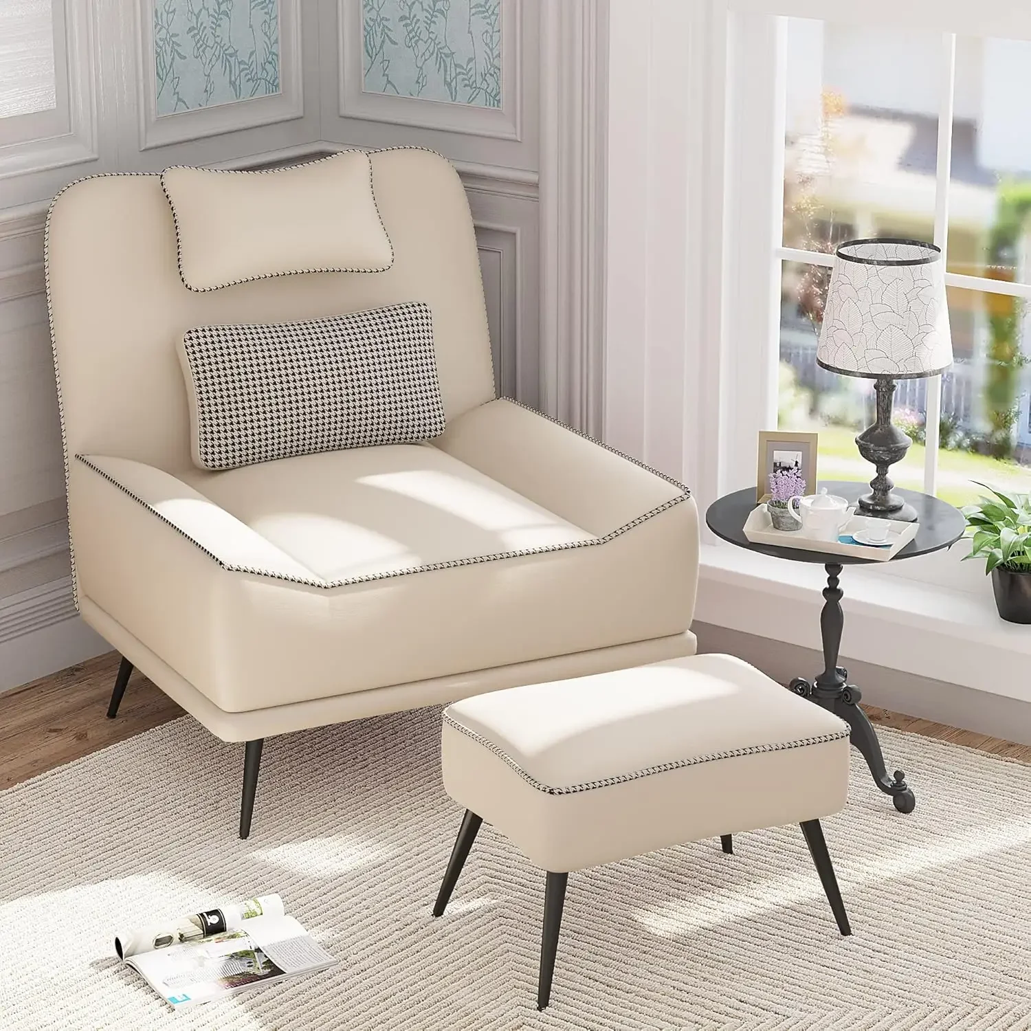 • 💎 【Chair and Ottoman Set】Single sofa chair with ottoman, matching removable headrest and waist pillow, 35"W x 26"D large seat is suitable for everyone, 22"W x 16"D ottoman can used as footrest, extra seating or vanity stool.