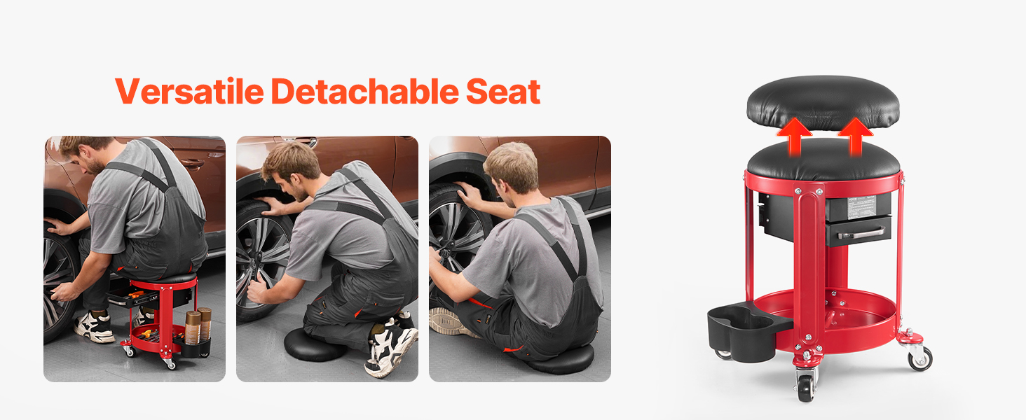 - Detachable Cushion: The rolling garage stool's cushion can be easily detached or installed and used as a kneeling pad, seat cushion, or backrest, offering flexibility for multiple purposes.