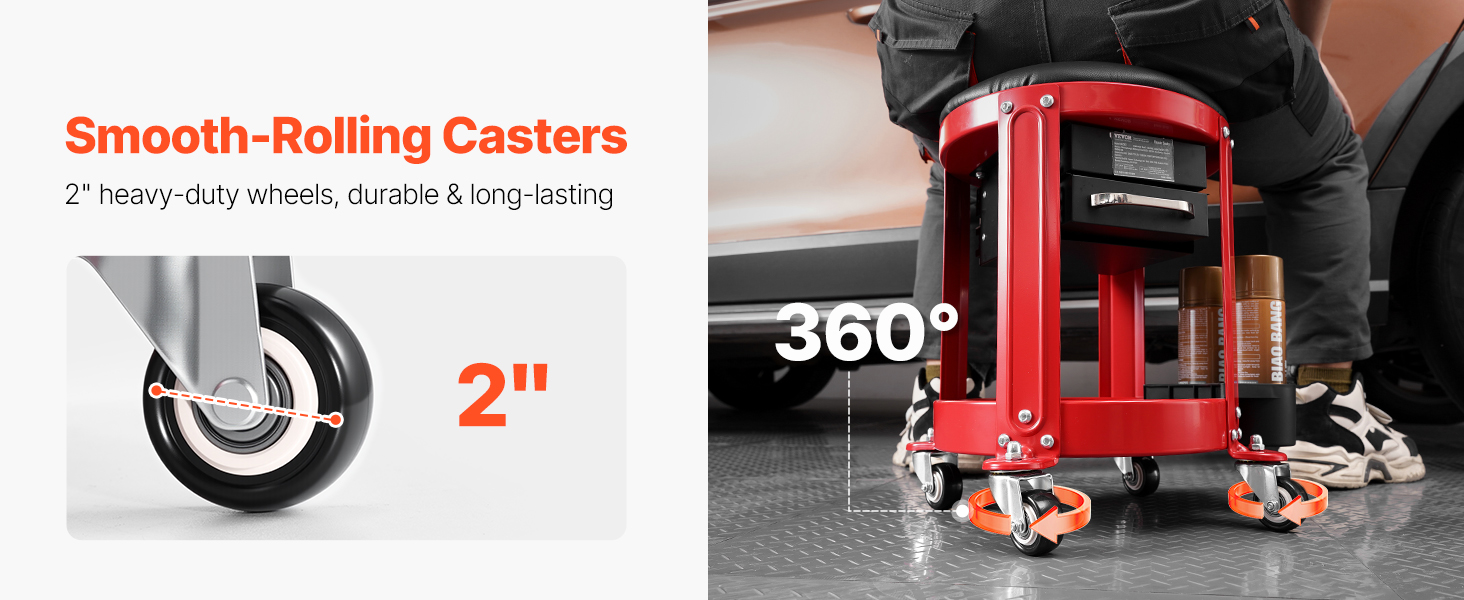 - Omni-directional Casters: This garage seat has 4 large-diameter 360° casters, allowing flexible movement even on complex surfaces. The ball-bearing casters feature anti-loosening nuts, ensuring they stay secure and provide smooth movement.
