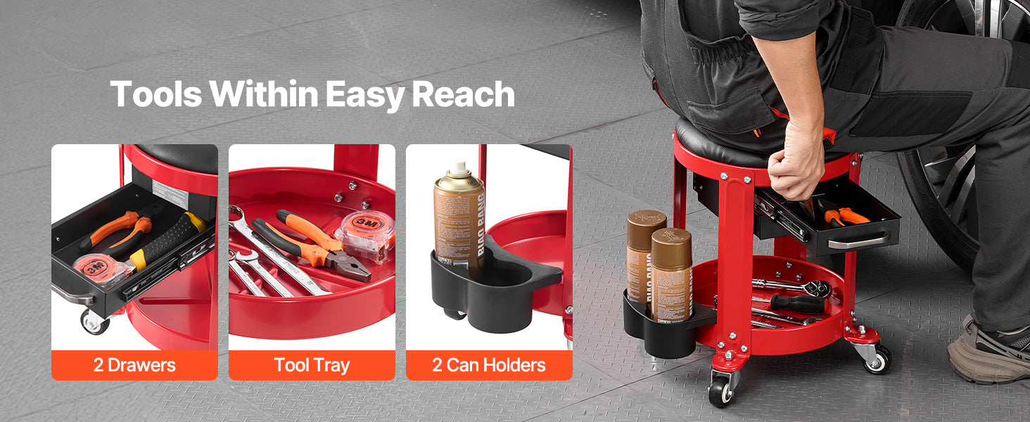 - Convenient Storage Space: This rolling mechanic stool features two drawers, a tool tray, and two can holders, providing ample space for storing tools and accessories and ensuring a tidier and more organized workspace.