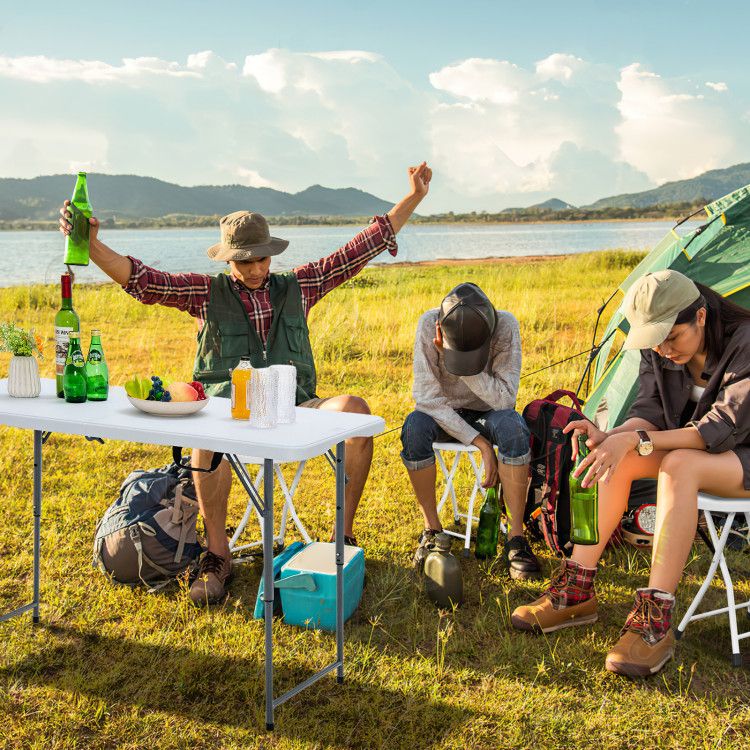 - - Construction: Sturdy X-shaped folding metal legs; integrated handle; reinforced joints