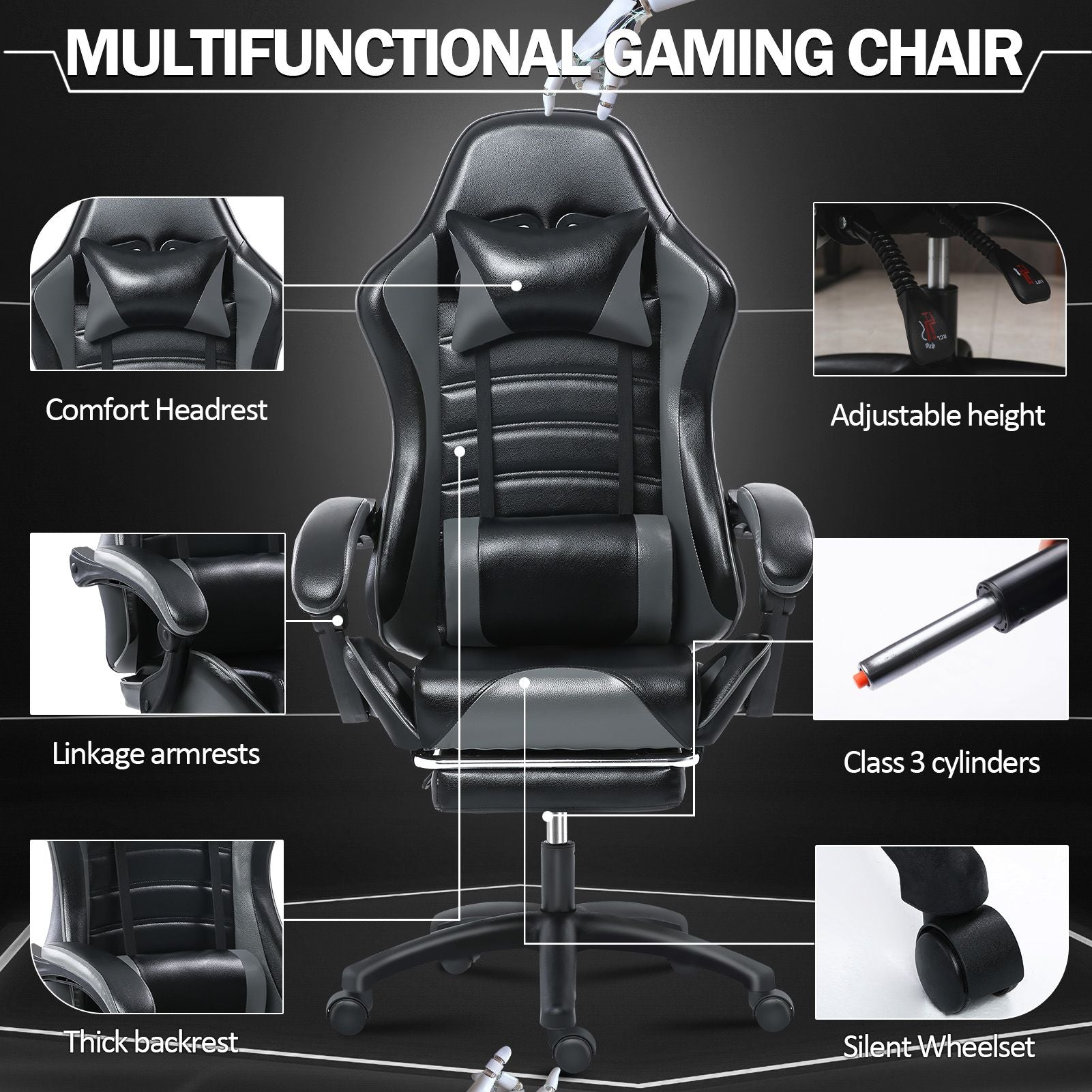 Game Chair, Adult Electronic Gaming Chair, Ergonomically Designed, PU Leather, Lounge Chair with Footstool and Waist Support, Office Chair, Gray