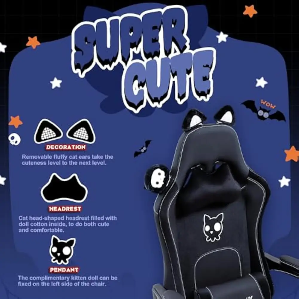 • Next Level Cuteness: What truly sets this gaming chair apart are the endearing cat ears perched on the top corners of the chair's backrest, cat-shaped headrest and cat doll. These whimsical accents add a delightful touch of playfulness and create an instant connection with anyone who lays eyes upon them. The cat ears and doll are removable and can be replaced with your favorite decorations.