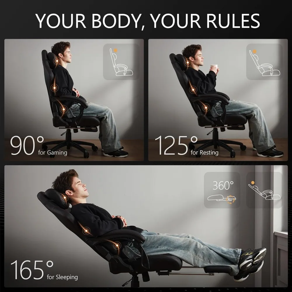 • Reclining Gamer Chair with 360° Swivel Footrest: Switch between work and play effortlessly. This reclining gaming chair offers 90°–165° adjustability plus a unique swivel footrest—perfect for gaming, streaming, or relaxation.