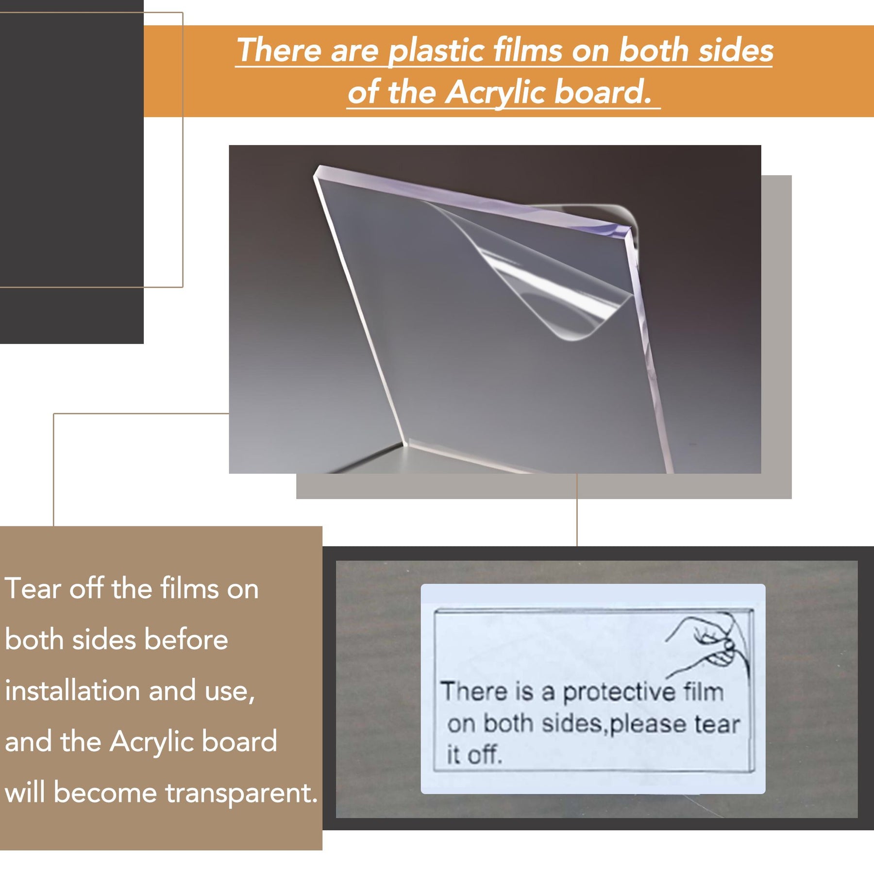 | Notice | There are plastic films on both sides of the Acrylic board. Tear off the films on both sides before installation and use, and the Acrylic board will become transparent. |