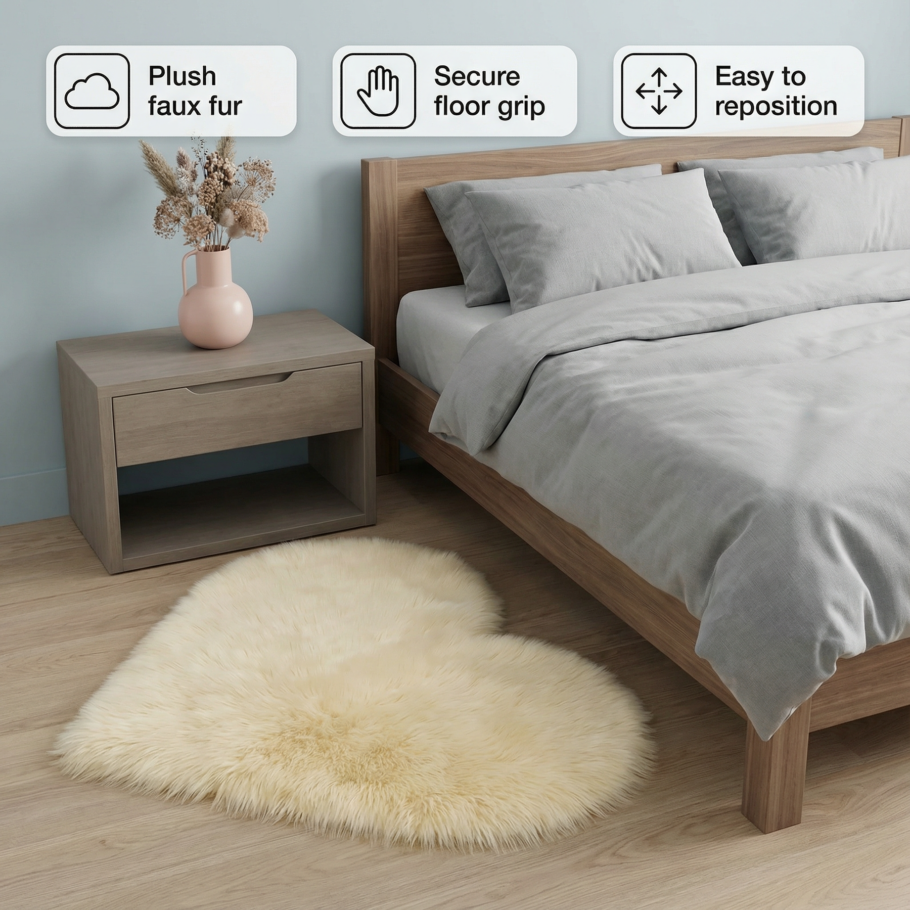 - Ultra-soft plush faux fur for luxurious underfoot comfort.