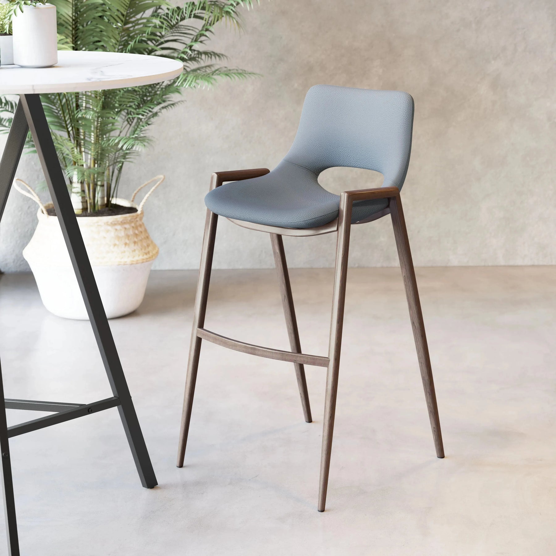 Modern elegance, combined with durability, the Desi Barstool Azure Gray & Walnut is exquisite and will transform your living space with this beautiful barstool. Its elegant Azure Gray & Walnut finish complements any kitchen, bar, or dining area. It is made of 100% polyurethane with a plywood and steel construction; it's quality material guarantees comfort and good support through its service life. The Barstool Azure Gray & Walnut is perfect for casual dining or entertaining guests, and is sure to make a fashionable addition to a counter, all while adding practicality to your life and sleek, contemporary aesthetic to your home.