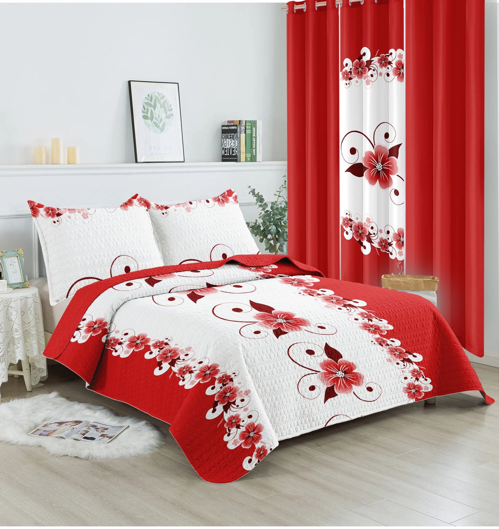 - Set includes: 1 bedspread, 1 zipper-fitted sheet, 2 pillowcases, 2 shams, 2 curtain panels