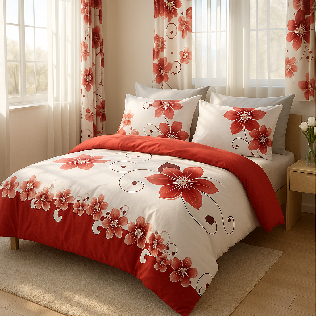 - 9 pieces, totally coordinated—bedspread, zipper-fitted sheet, pillowcases, shams, curtains, the works