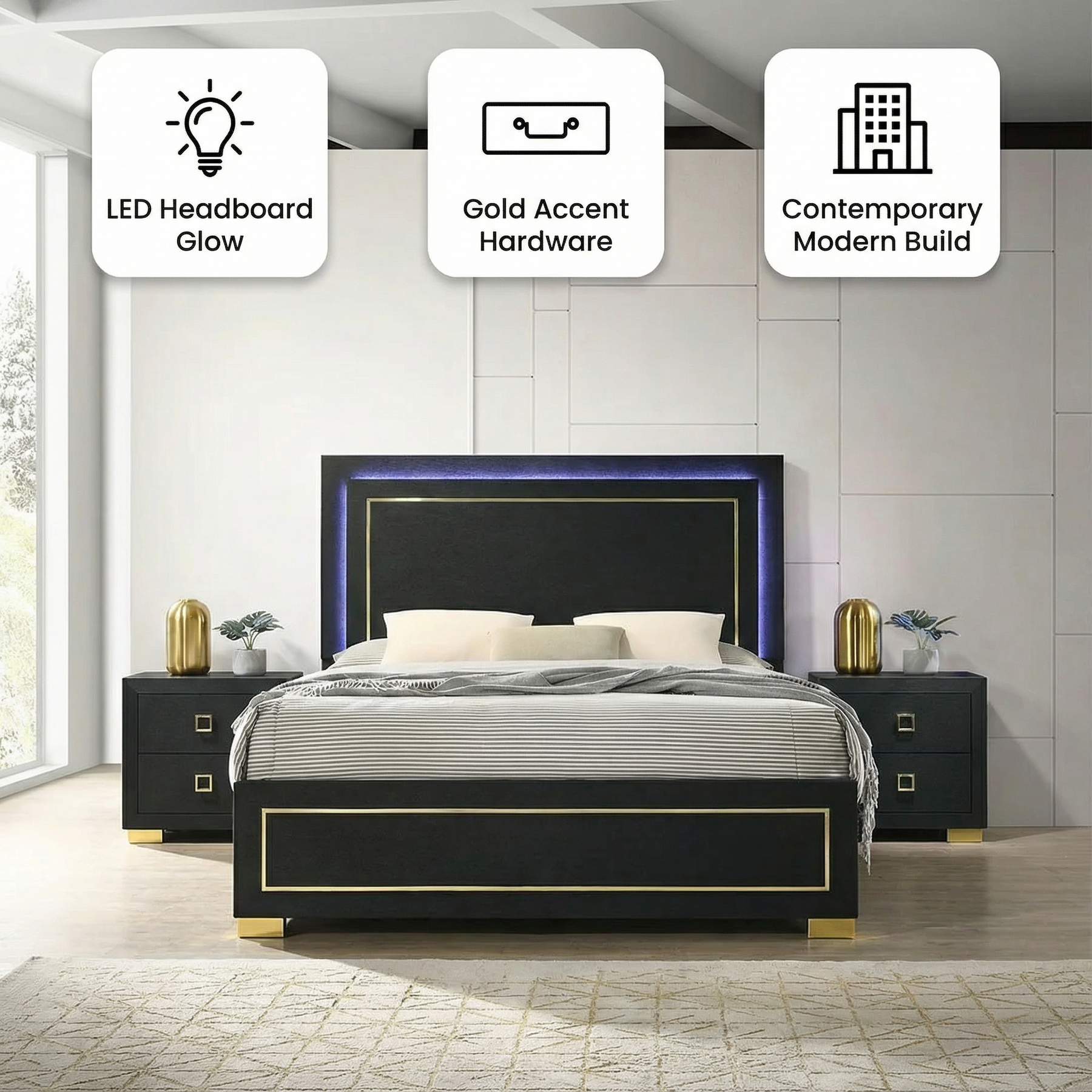 ContemporaryBlack ColorMelamine Paper, Engineered Wood, MetalLED on HeadboardGold Trim And Gold Metal Bracket LegsEnglish Dovetail ConstructionCenter Glide DrawersSquare PullsFoundation Required.