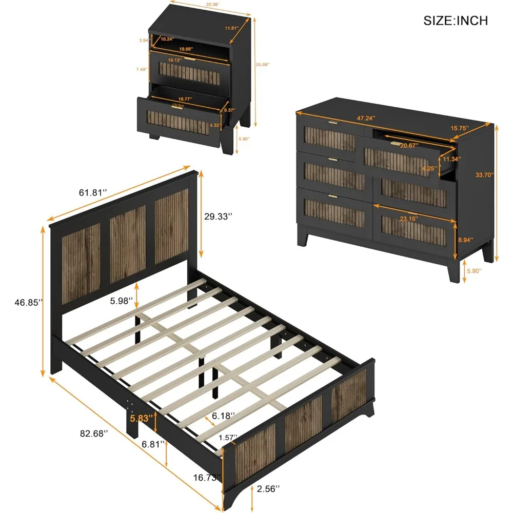 - [Dimensions and Assembly]: Dimension: Platform Bed: 82.68"L x 61.81" W x 46.85" H. Nightstand: 20.08"L x 11.81"W x 25.98"H. Dresser: 47.24"L x 15.75"W x 33.70"H. This bedroom set comes with detailed instructions that can be followed step by step to help you complete the assembly as quickly as possible.