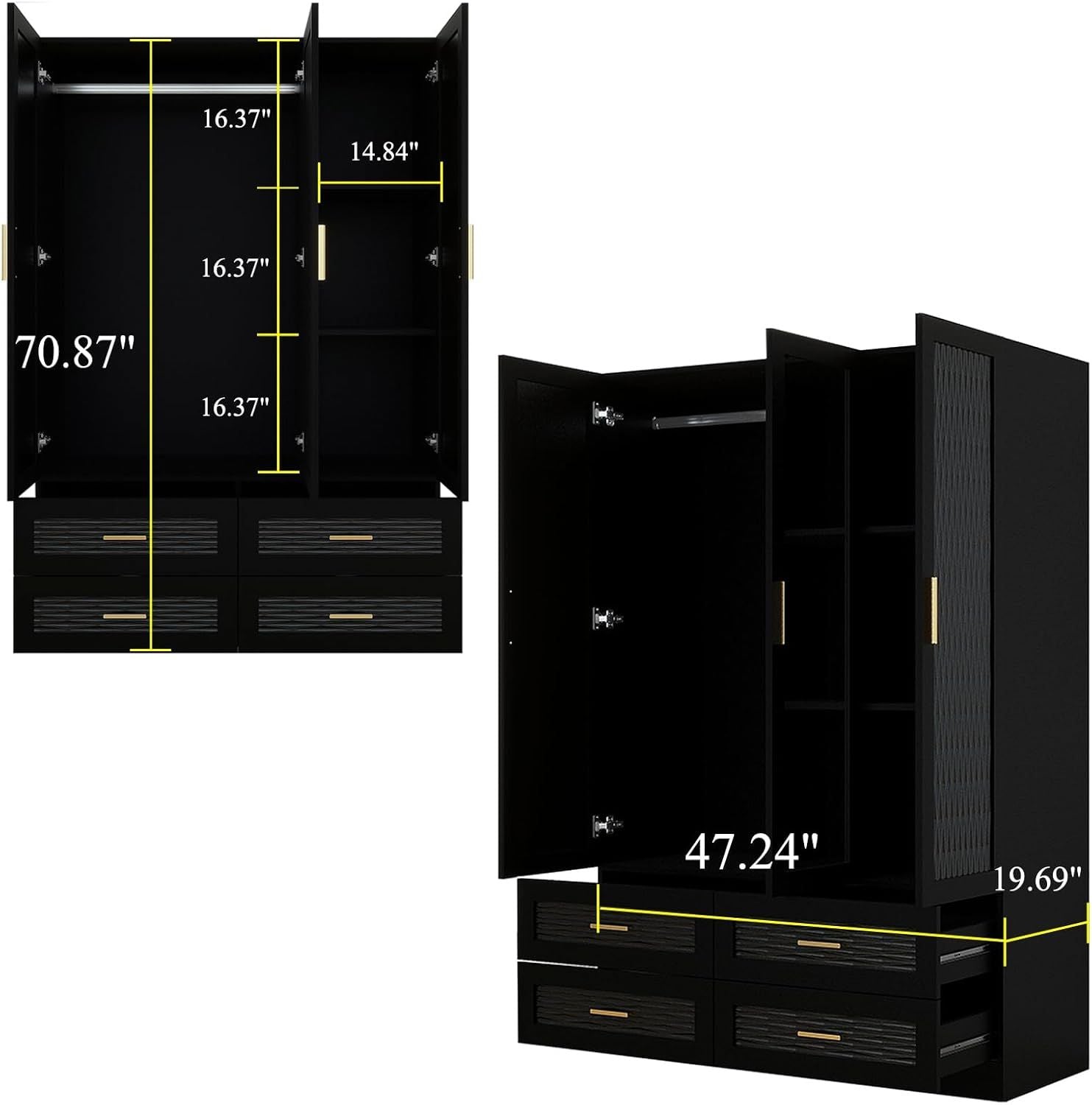 Modern Black Wardrobe – 3 Doors, Hanging Rods & Storage Drawers | Large Capacity Closet Cabinet | Trufairs