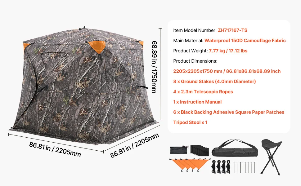 Stealth and Quiet: The ground blind is made of camouflage fabric with brush-in loops on the top and around the middle, making it easier to blend into the hunting environment. It also features silent sliding windows and a ground skirt to minimize detection and reduce disturbance to game.