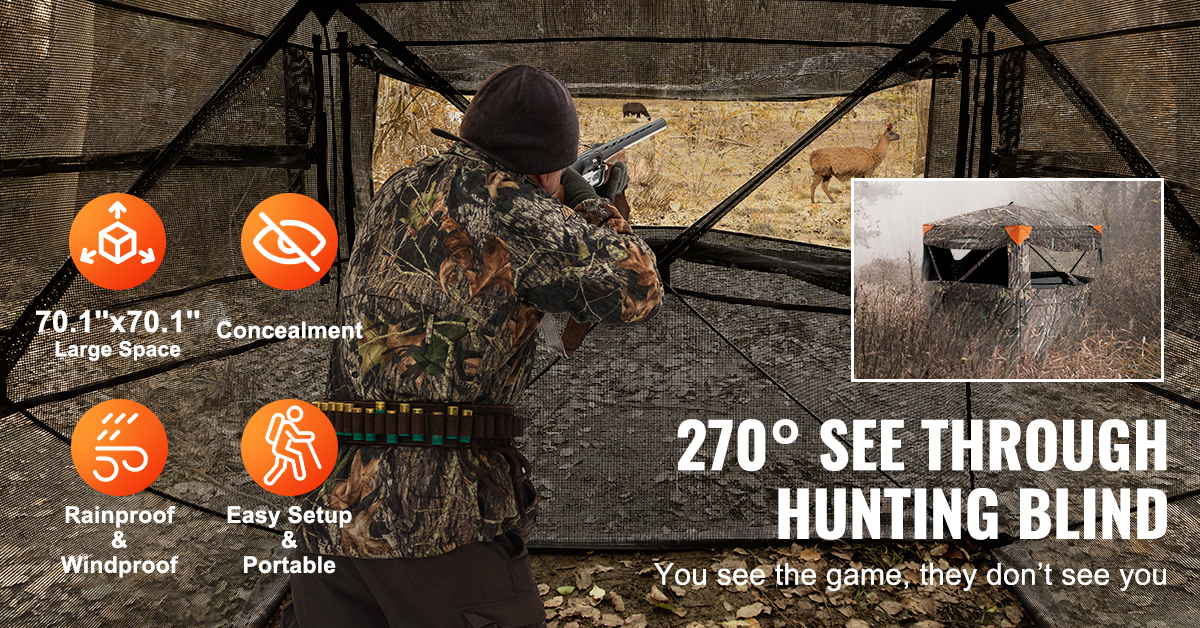 270° Wide Hunting View: Our hunting blind features three full panels of see-through mesh, using fabric perforation technology to provide a 270° wide field of one-way view. This allows hunters to have an excellent view of the surroundings and easily track and target game.