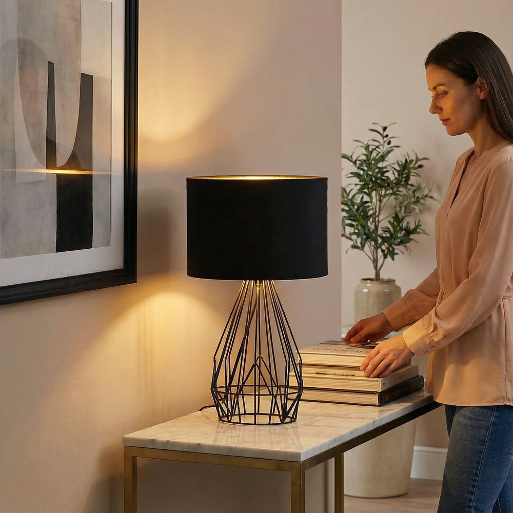 Black w/ Rose Copper Lining Uno-Fitter Cotton/Linen Drum Shade measures 9.75"L x 9.75"W x 7"H. Black Industrial Cage Table Body measures 6"L x 6"W x 13"H.