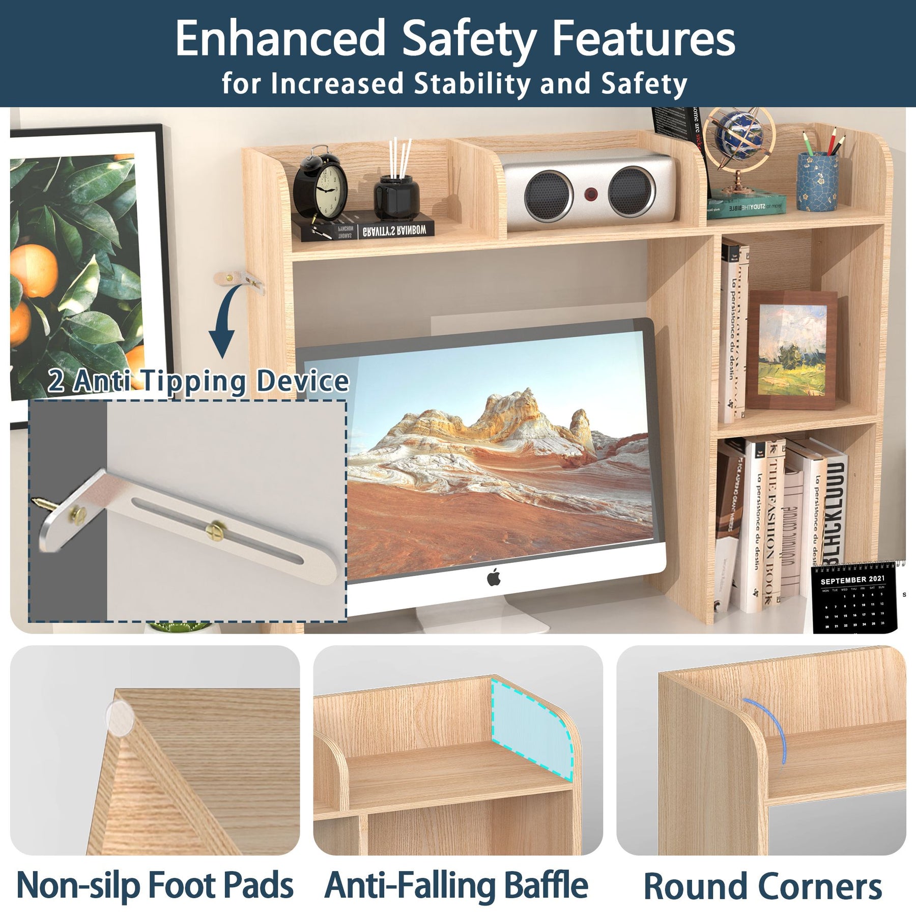 • - Safety Features: 2 anti-toppling kits, 6 non-slip pads, rounded corners, anti-falling baffle