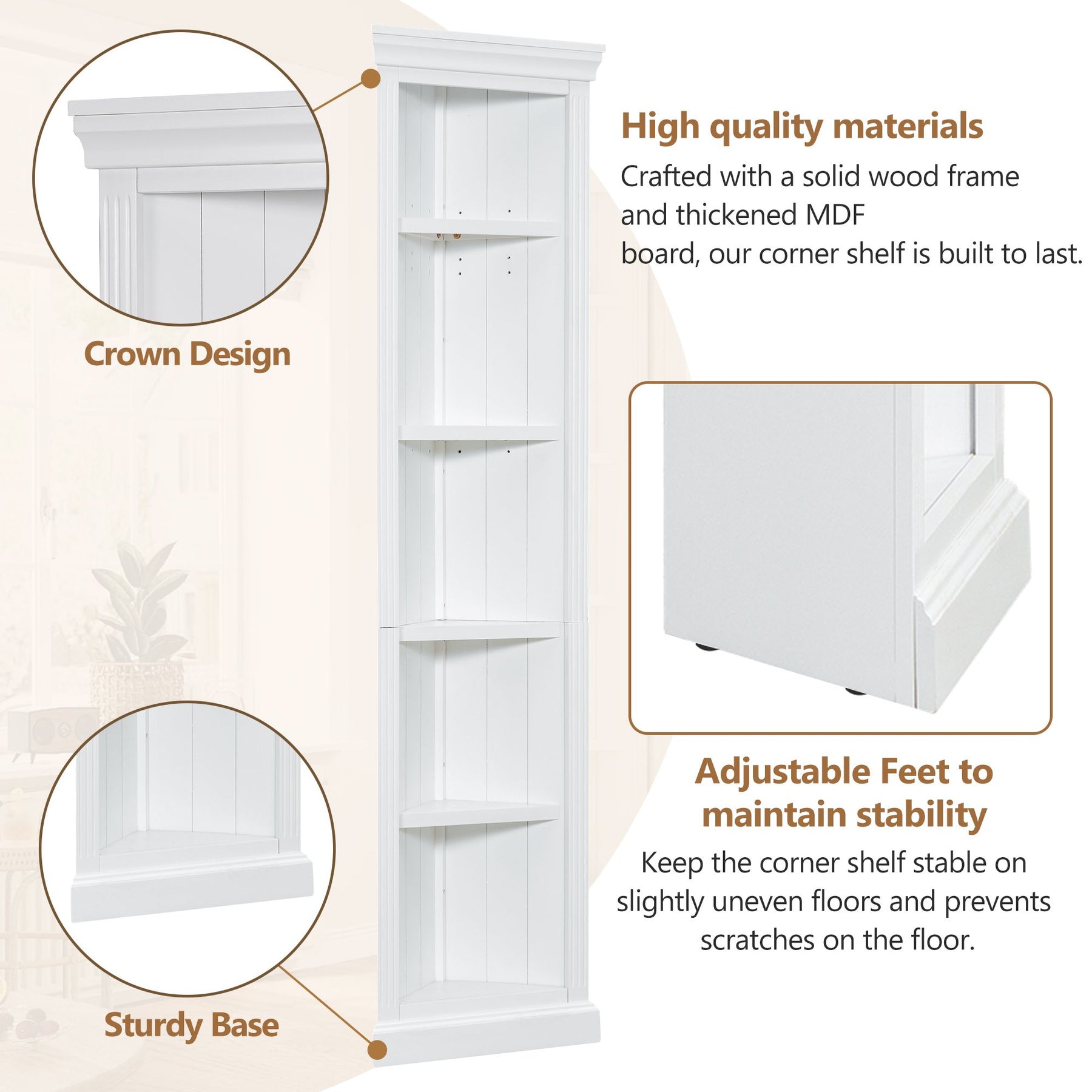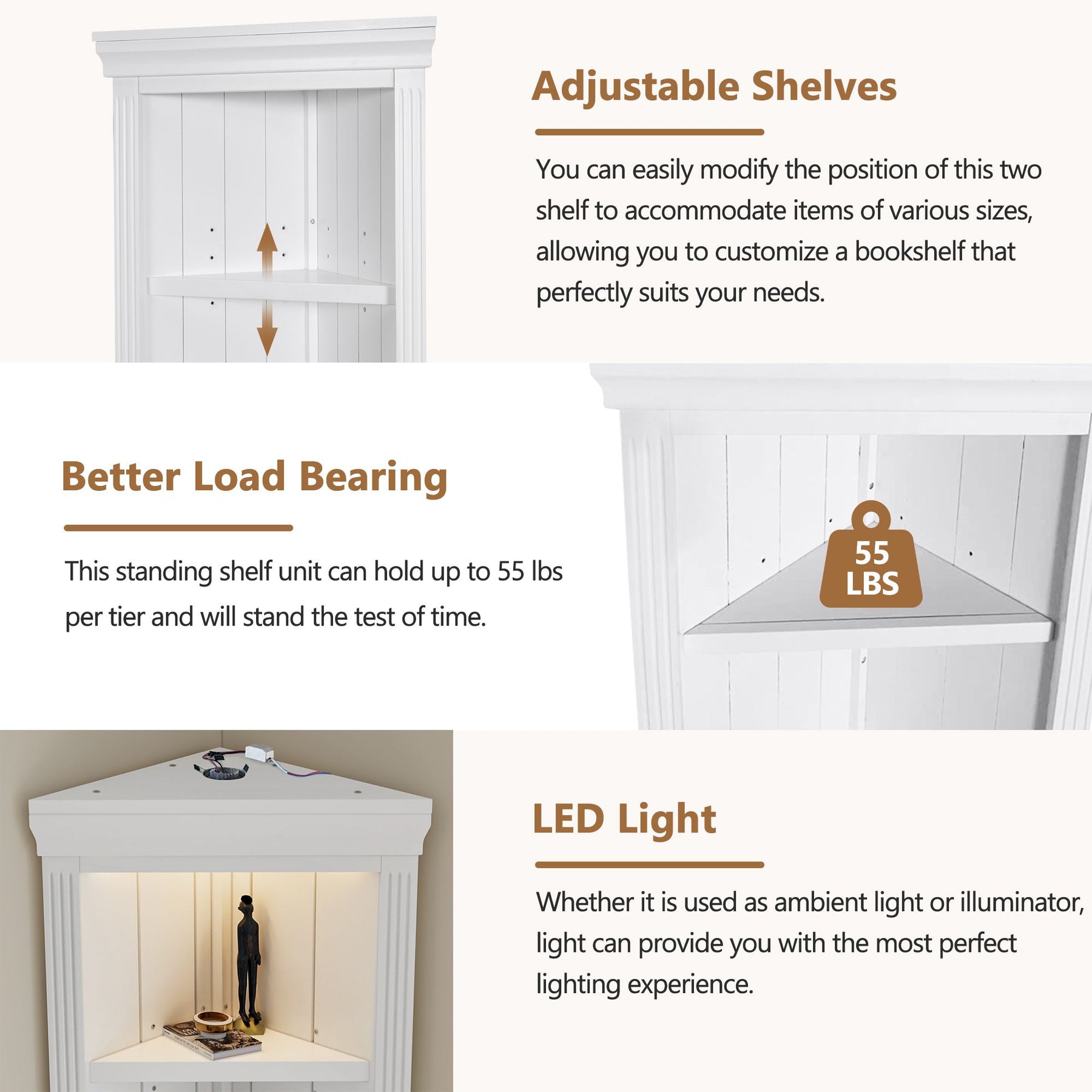 Stylishly maximize space in the corner with this ultra-modern 83.4” tall modern corner shelf unit with 5-tiered shelving, built-in LED lighting & sleek white finish — perfect for living rooms and home offices