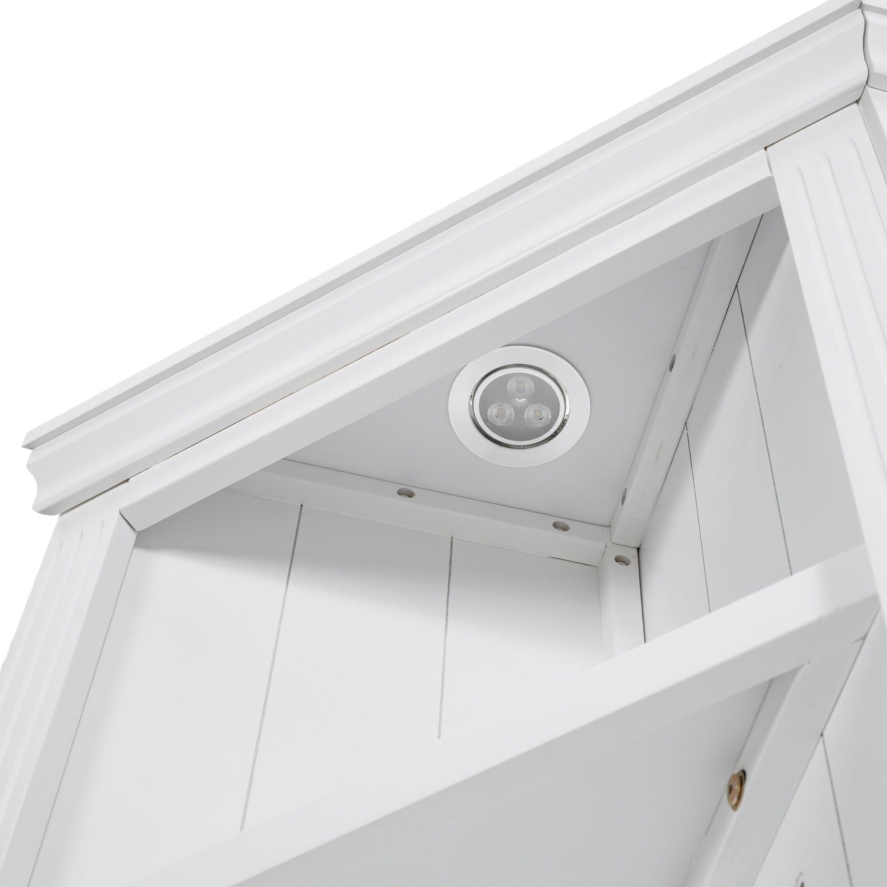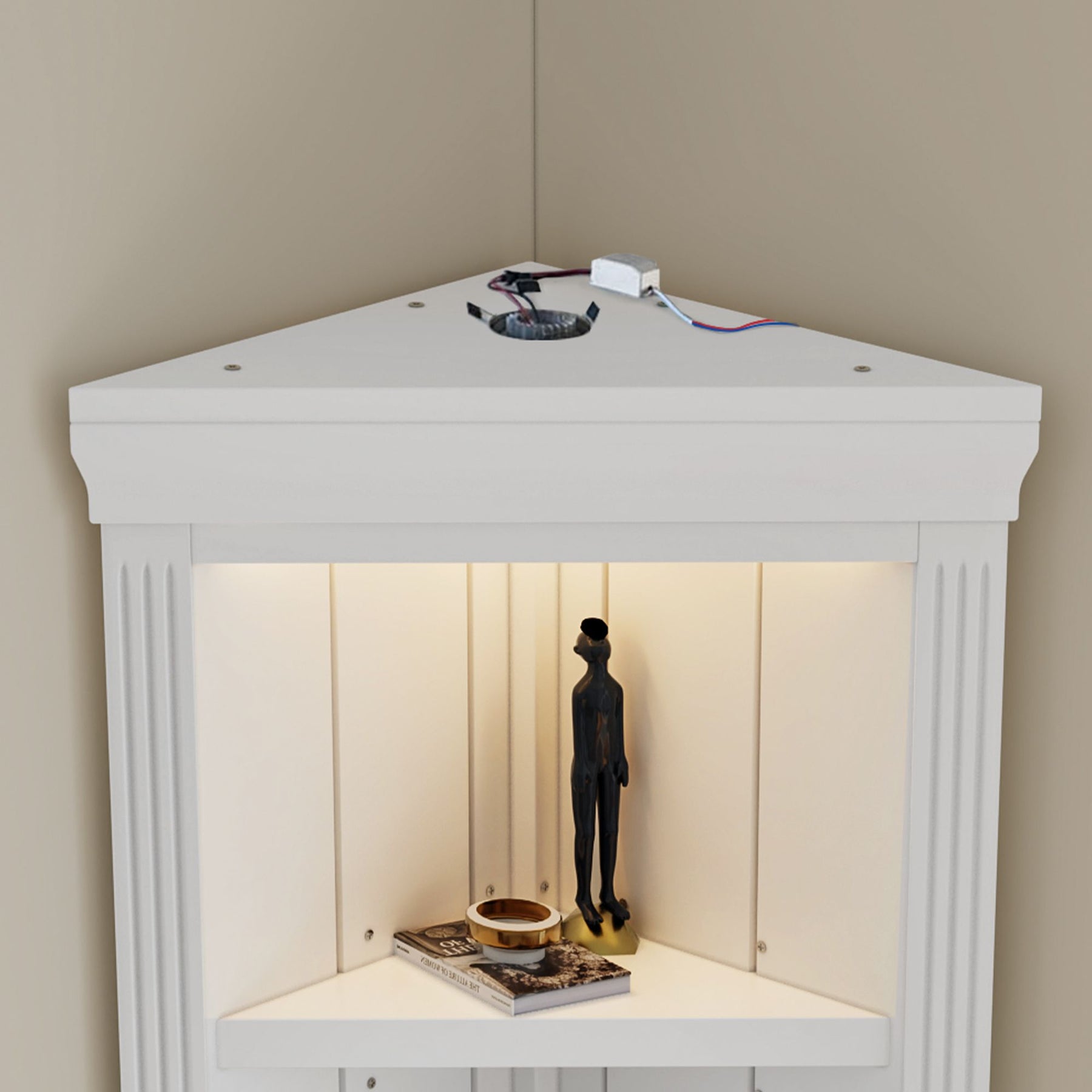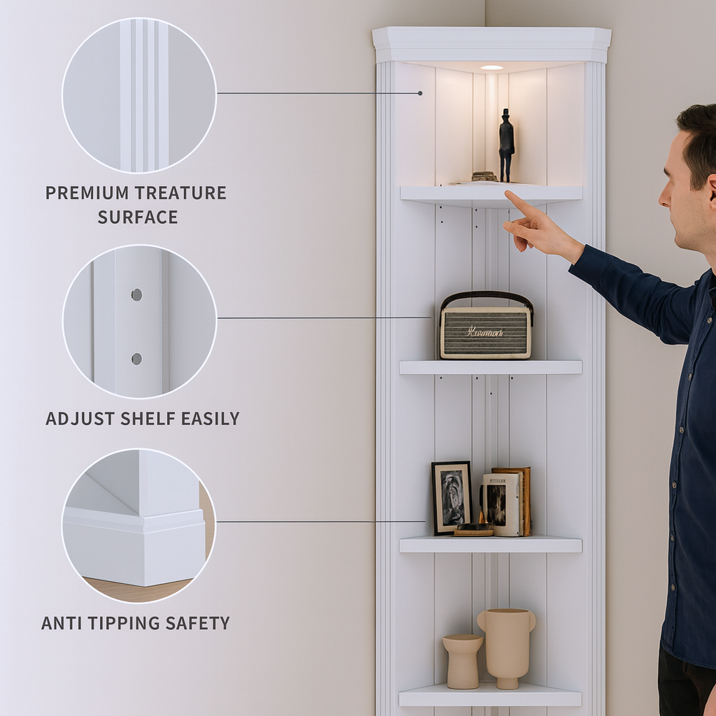 This corner shelf is designed for effortless installation, daily use and upkeep. It arrives in manageable components for home assembly; the adjustable feet allow you to level the unit even on uneven floors. To maintain its pristine appearance, simply wipe the painted surfaces with a soft damp cloth periodically and dust the shelves regularly. The built-in LED light adds visual interest while requiring minimal maintenance—just replace the bulb when needed.
