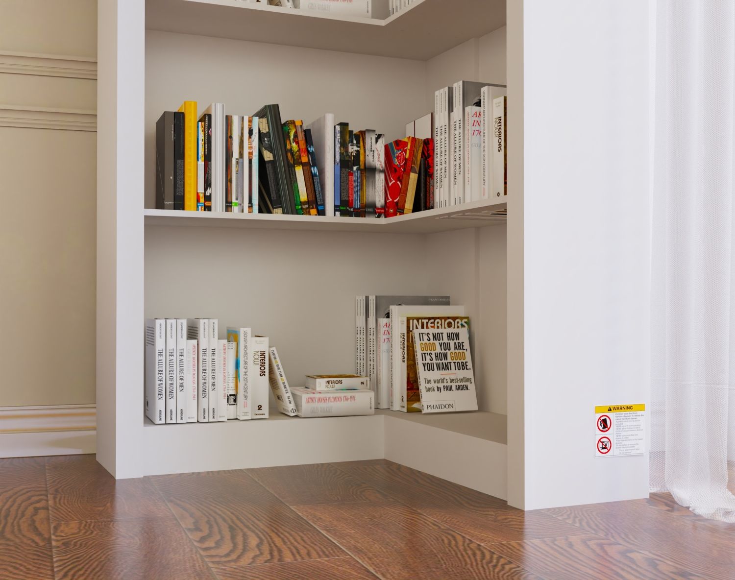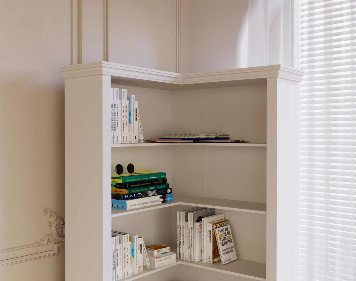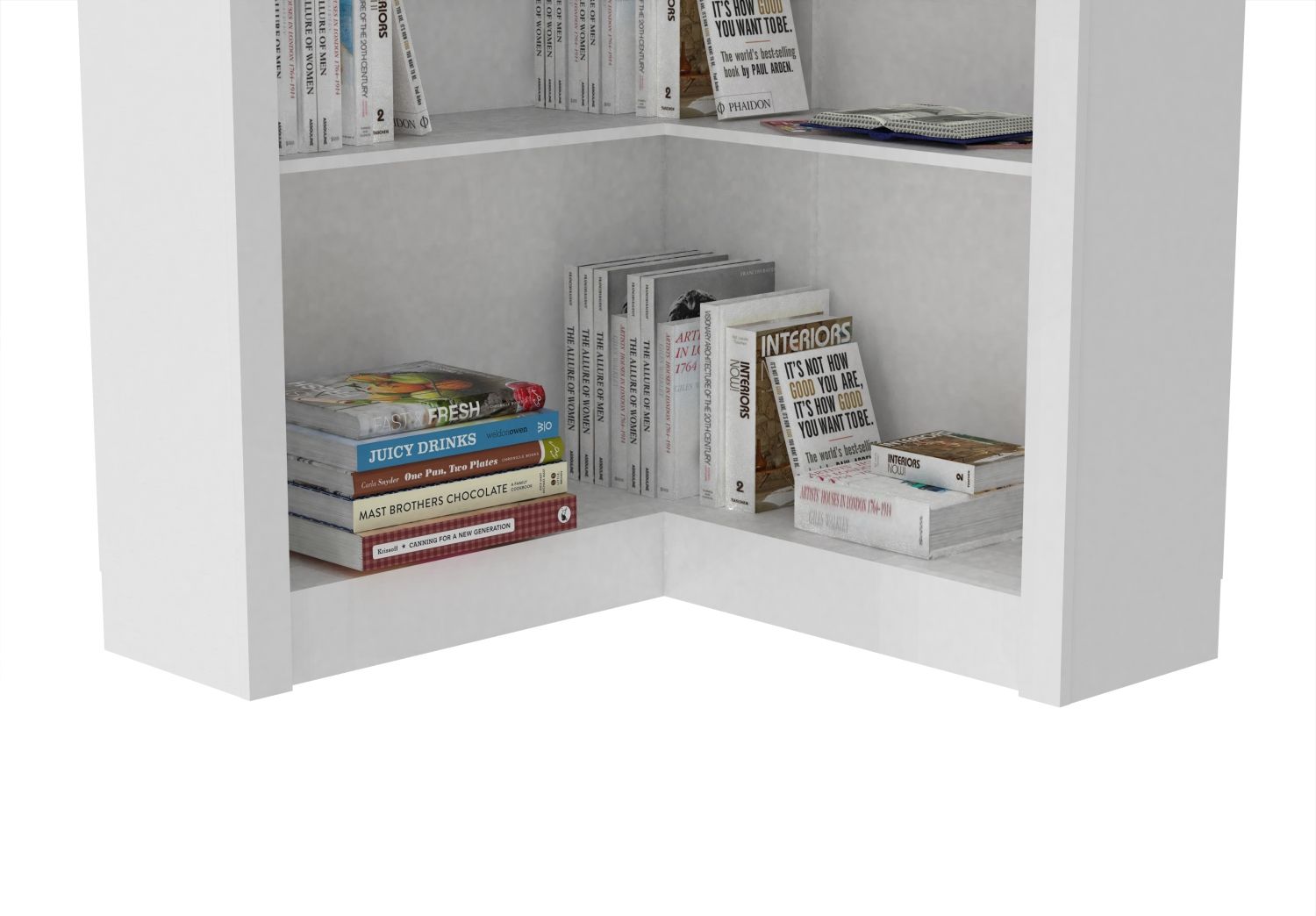 Great use of corner space. The shelves are wide enough to store books and display decorative items. Looks elegant and minimalistic.