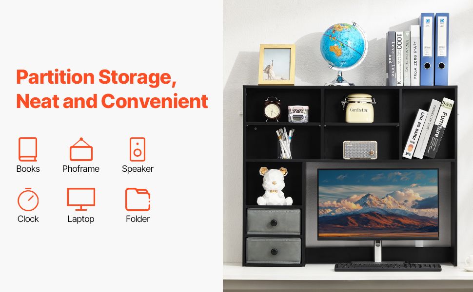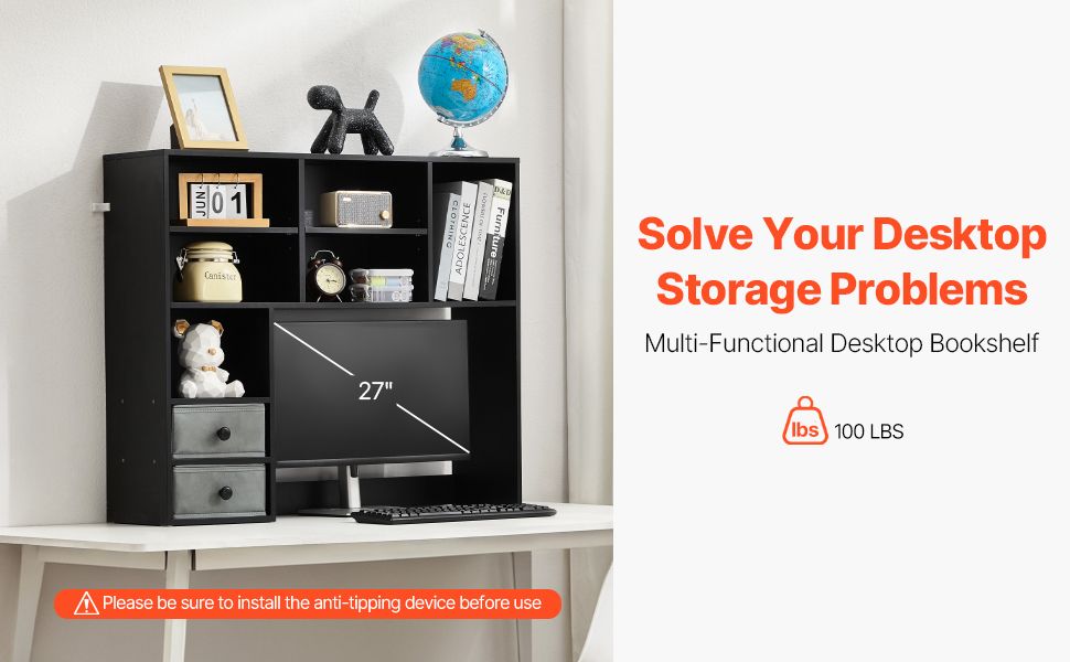 - Large Capacity: This desktop bookshelf measures 37.0" x 10.0" x 31.1" / 94 x 25.4 x 79.2 cm. Say goodbye to cluttered desks with our desktop bookshelf. Designed specifically for computer desks, it can hold a 27-inch monitor and features compartments to organize books, office supplies, and more, creating a tidy work environment and boosting productivity.