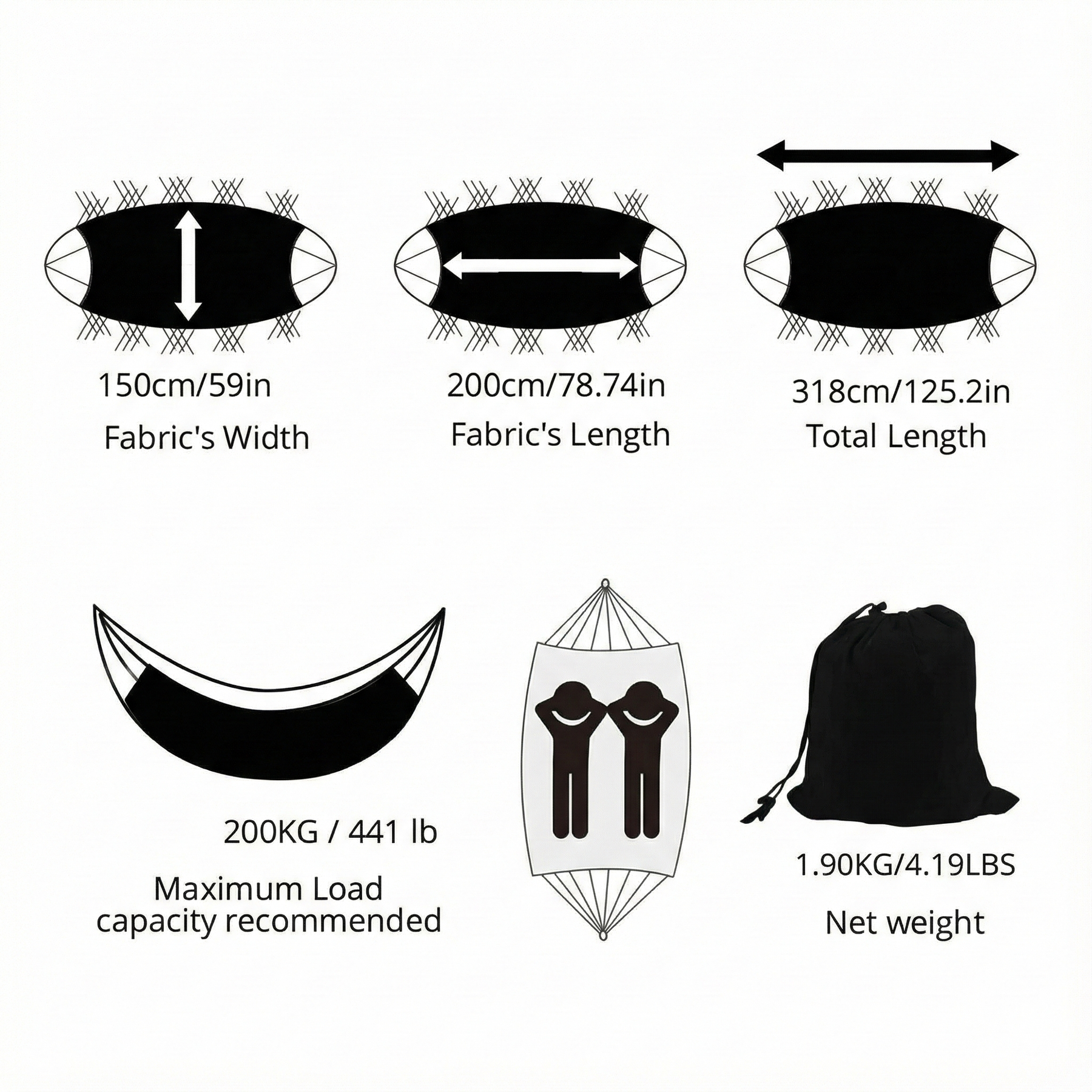 • Generous size hammock designed for two people, ideal for lounging, reading, or sharing outdoor relaxation.