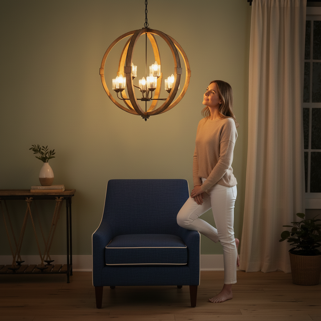 9- Light Globe Chandelier, Wood Chandelier Hanging Light Fixture with Adjustable Chain for Kitchen Dining Room Foyer Entryway, Bulb Not Included
