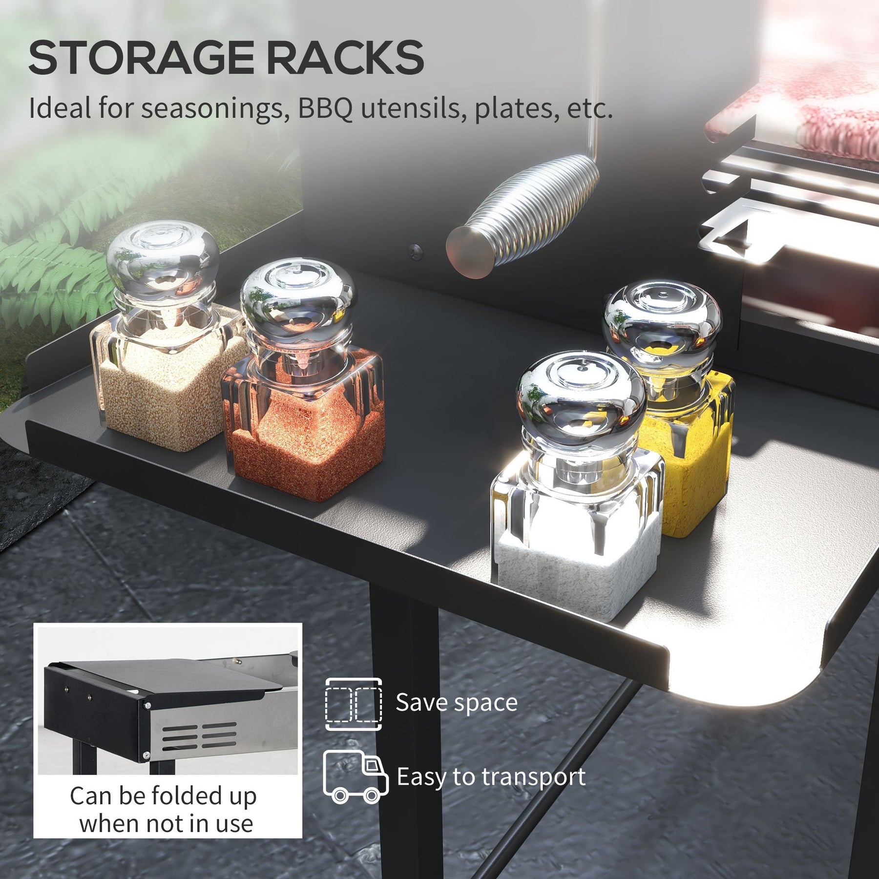 • - Construction: Free-standing, dual function grill and rotisserie with foldable storage shelves.