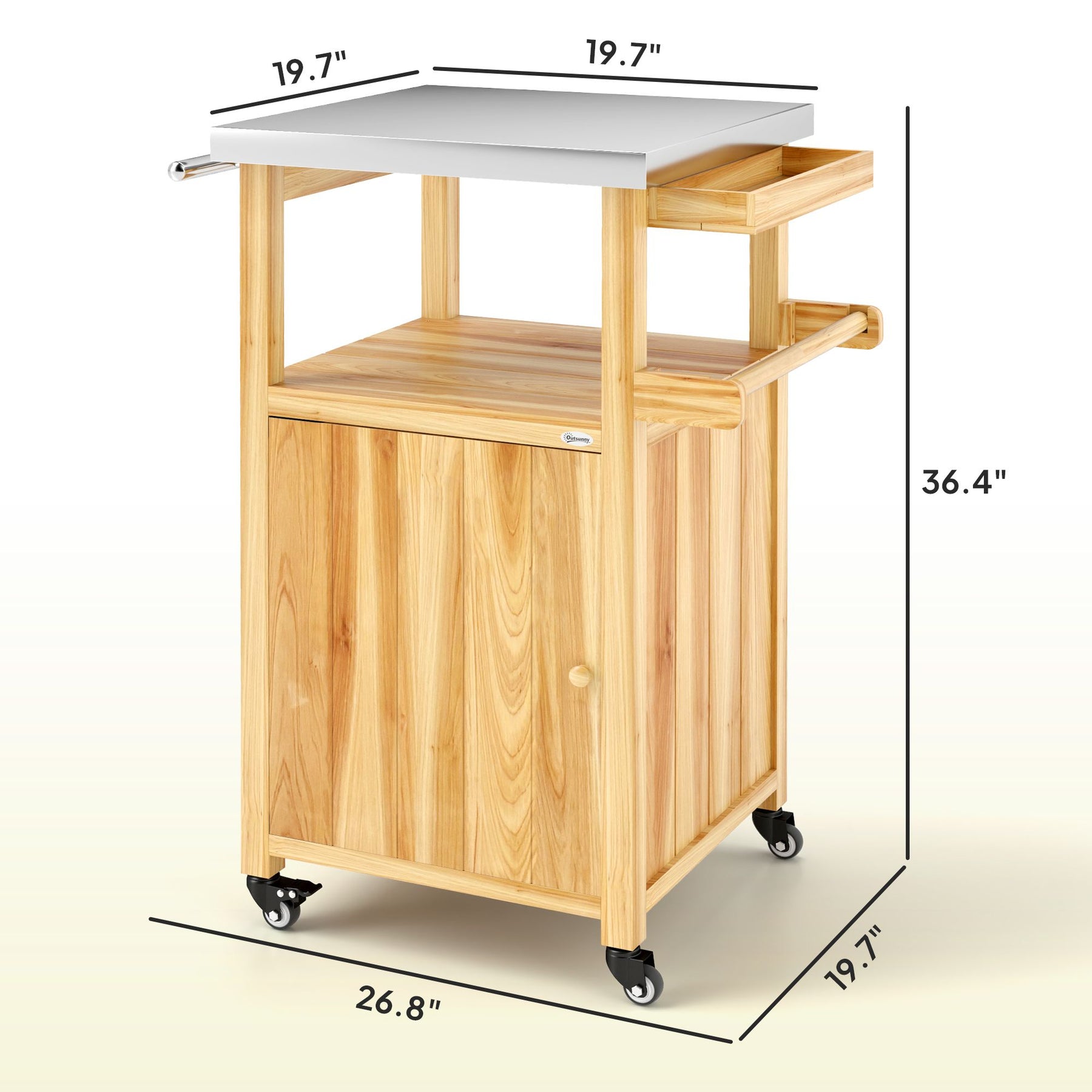 Outsunny Outdoor Grill Cart w/ Stainless Steel Top, Solid Wood Outdoor Kitchen Island w/ Wheels, Integrated Hole, Natural Wood