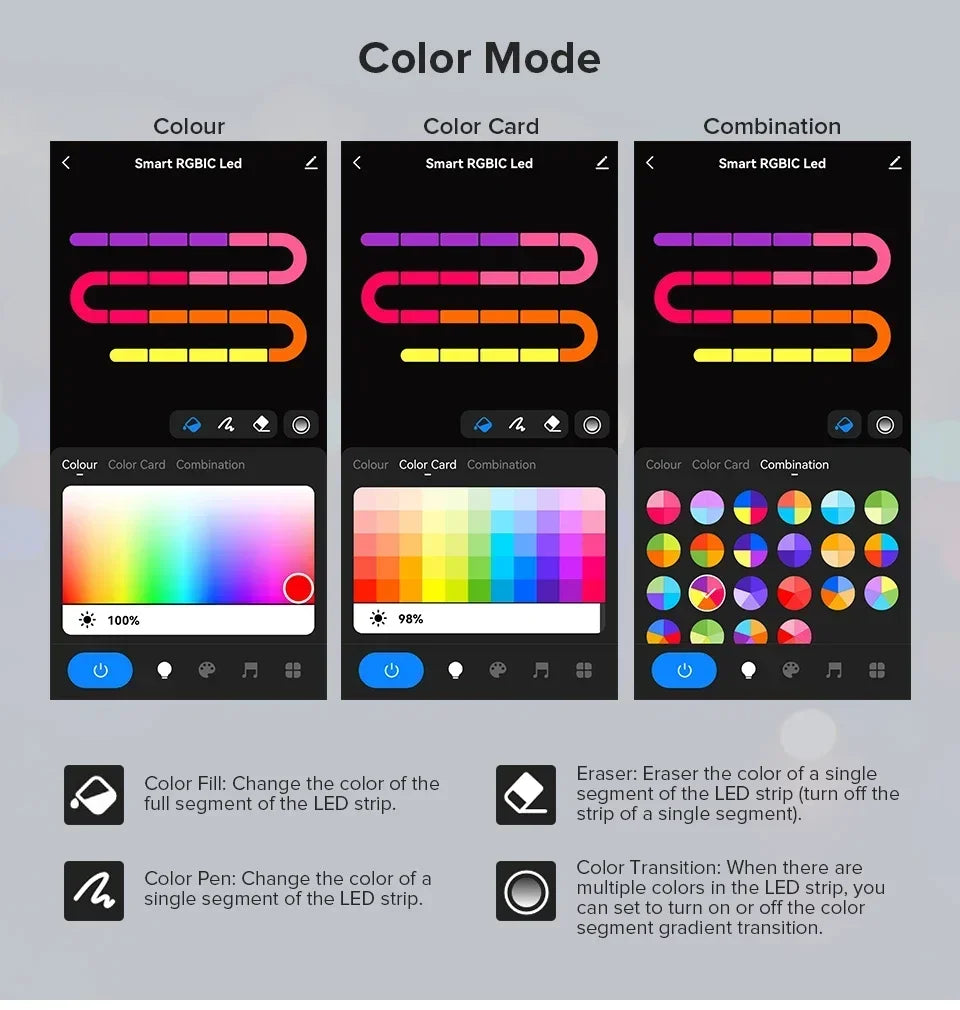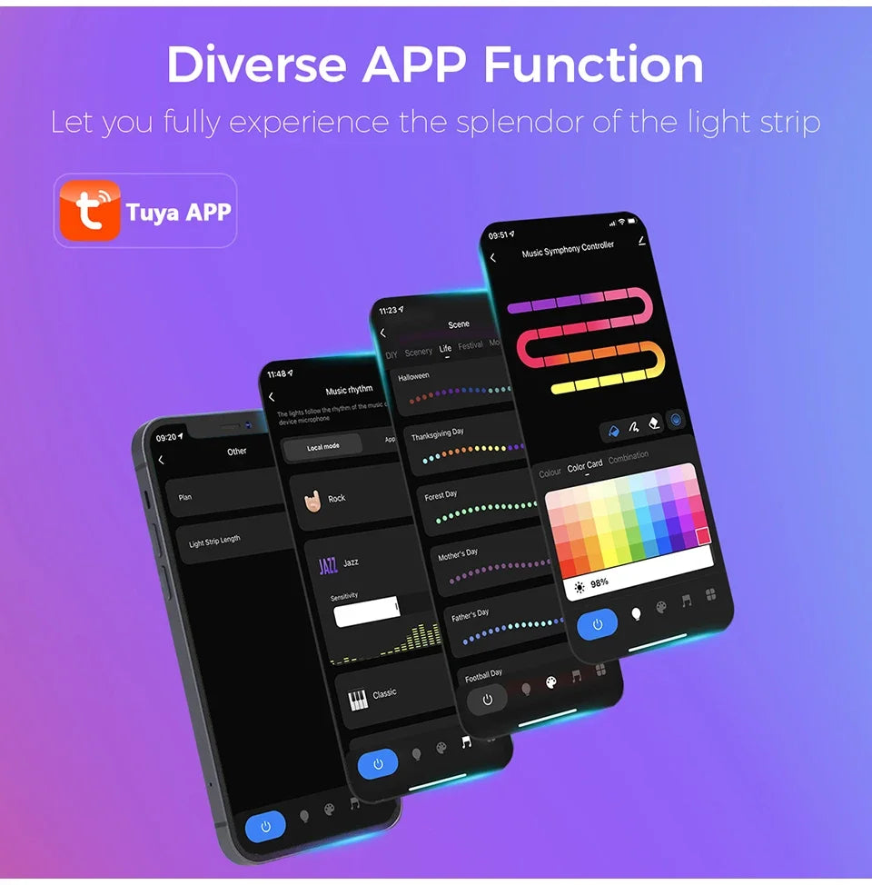 ---App Control:Work with Tuya Wifi and bluetooth.Join your smart home through wireless and Bluetooth connections, and you can set the lighting you want on your phone, making it more convenient to use