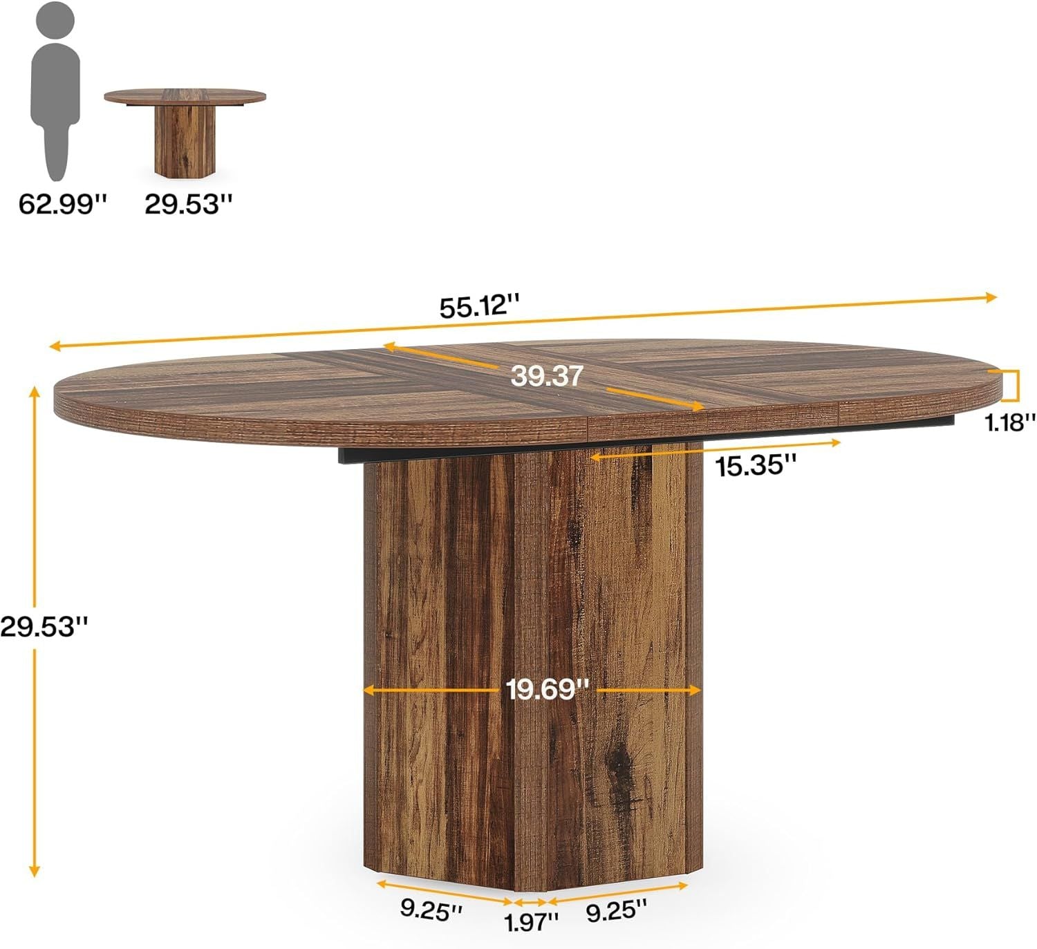 The Trufairs 55.12 Inches Oval Conference Table measures 55.12" in length, 39.37" in width, and 29.53" in height, with a tabletop thickness of 1.18". Its polygon-shaped base features a 15.35" front panel width, 19.69" side panel width, and 9.25" bottom edges with a 1.97" inset section, providing both stability and style for daily use.