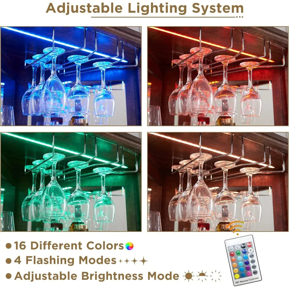 corner bar storage cabinet, 72" tall farmhouse wine cabinet w/barn door & adjustable shelf, home bar w/led light & glass rack f