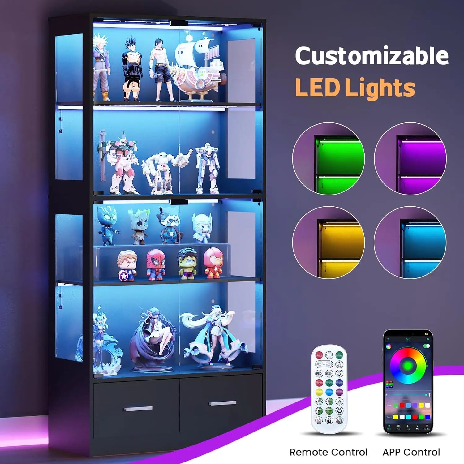 • 💗【Dynamic RGB Lighting Display】- This glass door display cabinet features smartphone-controlled RGB lighting with multi color combinations. Customize ambiance through the app or remote control, transforming living rooms or offices into vibrant showcases for collectibles while maintaining seamless integration with home decor.