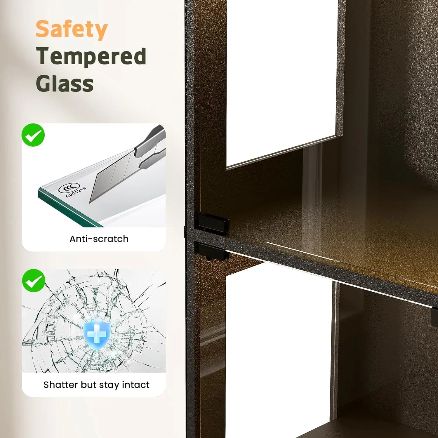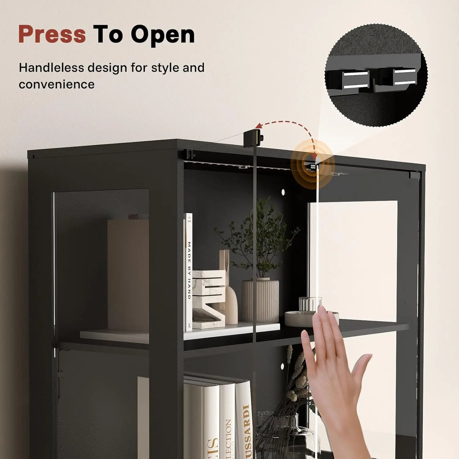 • 💗【Smart-Access Glass Front】- Experience effortless entry with the premium display cabinet’s push-to-open glass doors. The flush-mounted safety glass panels eliminate protruding handles, creating a streamlined modern aesthetic while preventing accidental impacts in high-traffic areas.
