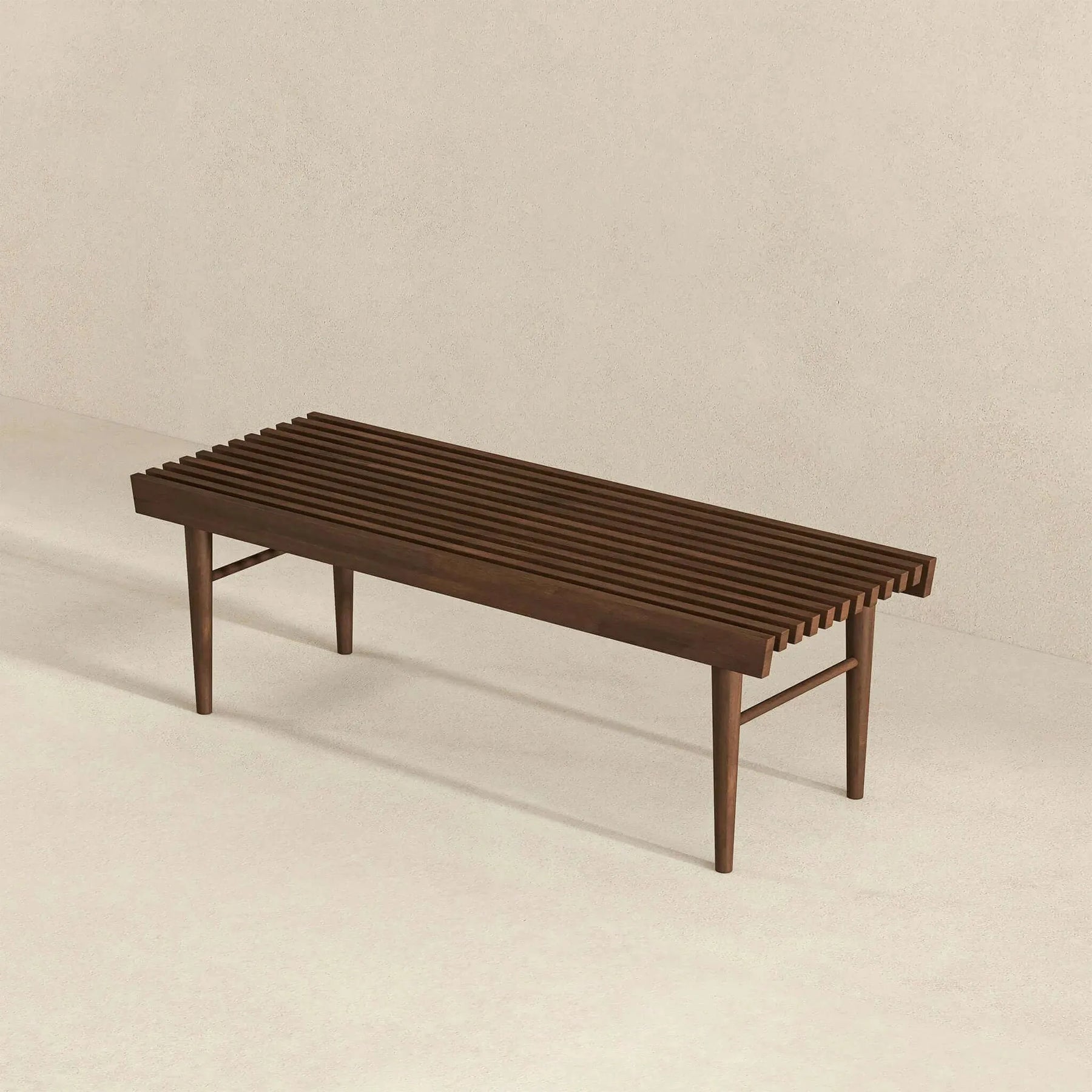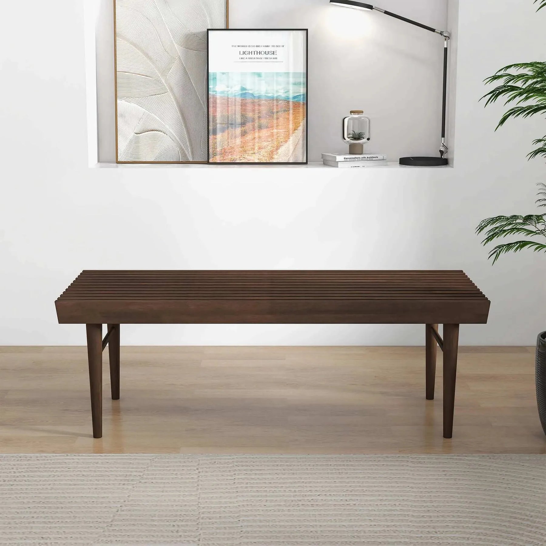 Timi Mid Century Modern Solid Wood BenchThe Mia Mid Century Modern Solid Wood Bench adds a touch of elegance to any home while also being one of the most durable pieces of furniture you can buy. With a solid wood construction, this bench comes in an elegant brown stain; a practical seating option for any space. Whether located in an entryway, dining area, or living room, its mid-century modern design complements a variety of decor styles. Made from durable hardwood construction, it is time tested for durability, feels good did to its smooth surface and display a beautiful pattern of wood. With a comfortable design and ample space, this bench is an eye-catching addition to any room in your home.