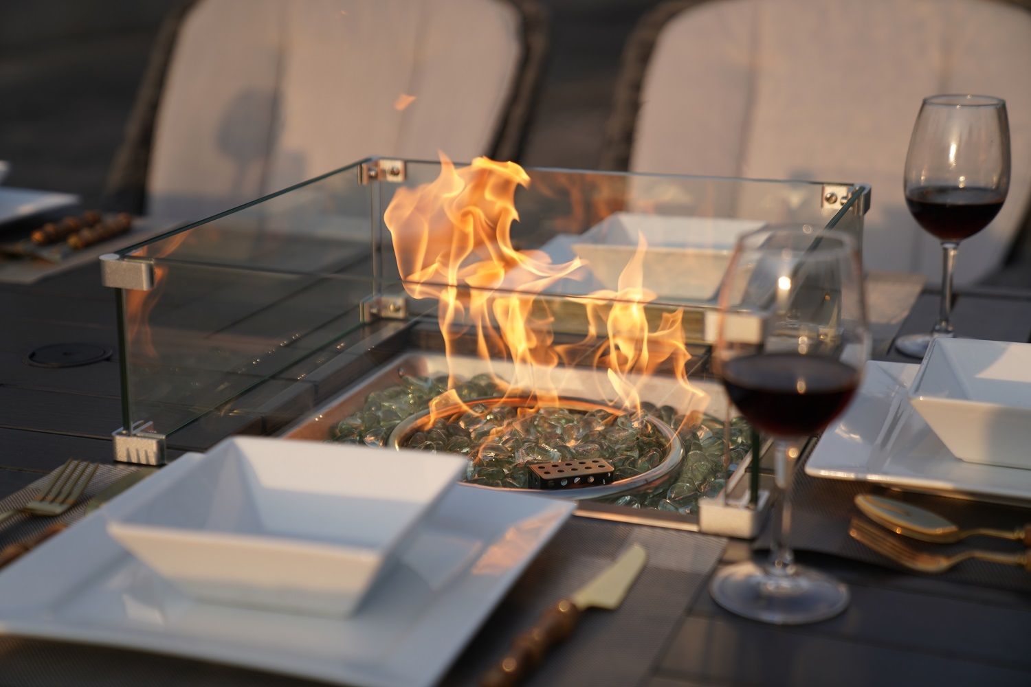 - Rectangular ceramic-tile tabletop provides ample dining space when flame is off