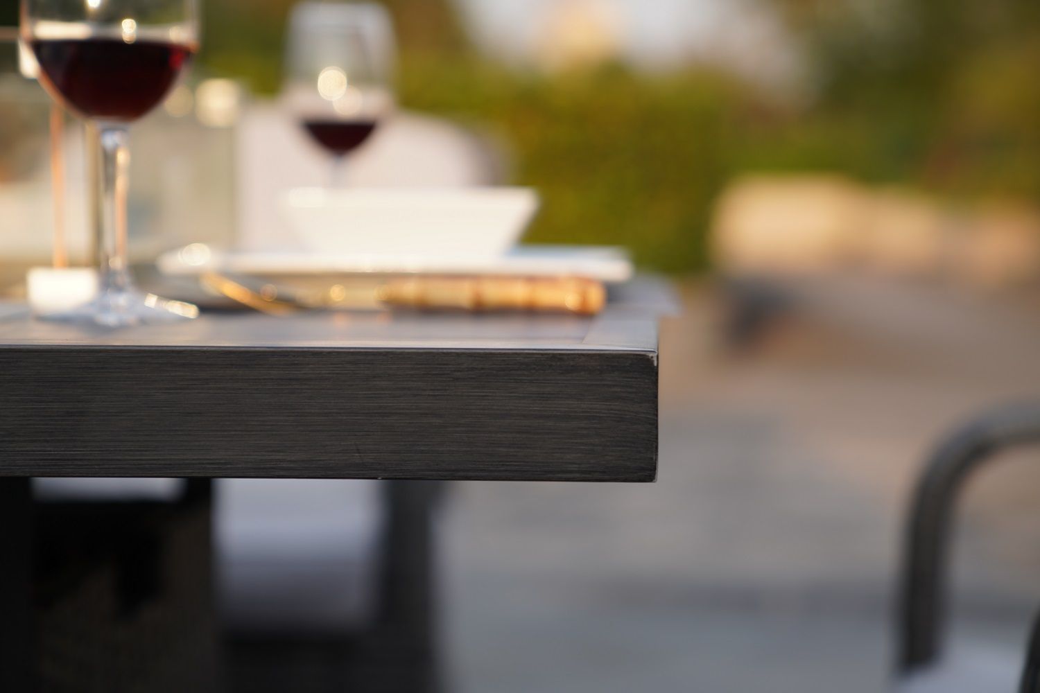 • - Materials: powder-coated aluminum frame, hand-woven PE wicker, ceramic-tile tabletop, stainless-steel burner & ice well
