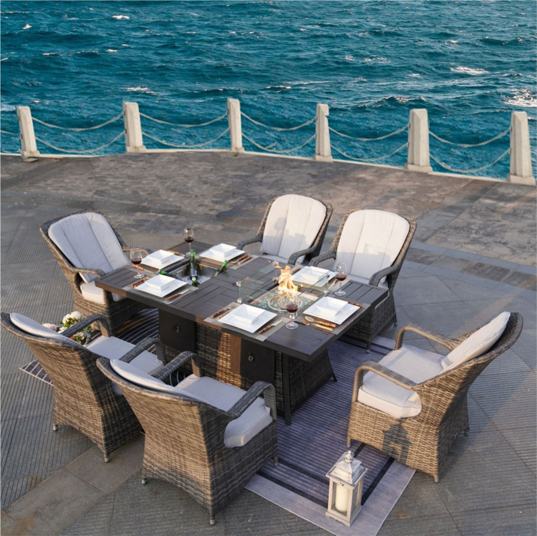 Elevate your outdoor space with the Seaside Wicker Firepit Dining Set—featuring a built-in ice bucket and a 50,000 BTU gas fire table designed to transform patios, decks, and poolside areas into year-round gathering destinations. This set combines a spacious rectangular fire table with six cushioned wicker chairs, offering both the inviting warmth of a flickering flame and the convenience of an integrated ice well in one refined centerpiece. The design’s clean lines, rich dark-espresso wicker, and neutral sand-beige cushions blend seamlessly with coastal, contemporary, or rustic outdoor décor. The beveled ceramic-tile tabletop elegantly borders the fire glass centerpiece, and a removable lid allows the table to convert easily from a fire feature to a full dining surface.