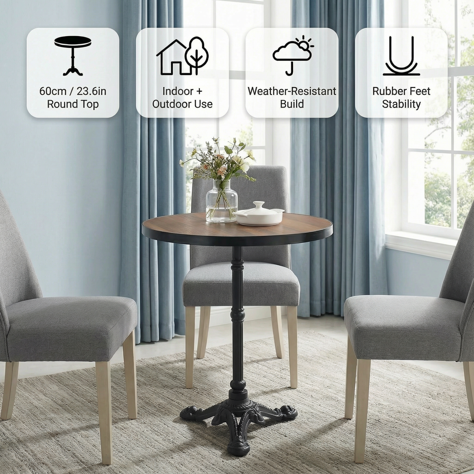 • Compact 60cm diameter ideal for intimate two-person dining.