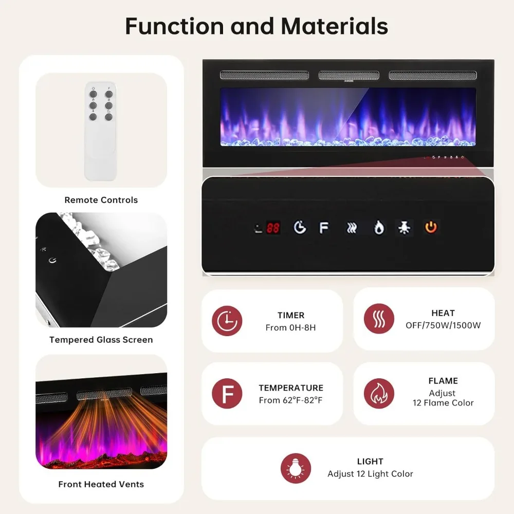 High-Tech Electric Fireplace: Our fireplace has realistic 3D flame effects and glowing logs. The warm ambiance is provided but without dust, firewood, or smoke. Users can enjoy 12 changeable LED colors and five levels of flame brightness. Adjustable temperature settings from 62°F to 82°F. You can revise the timer from 1H to 9H