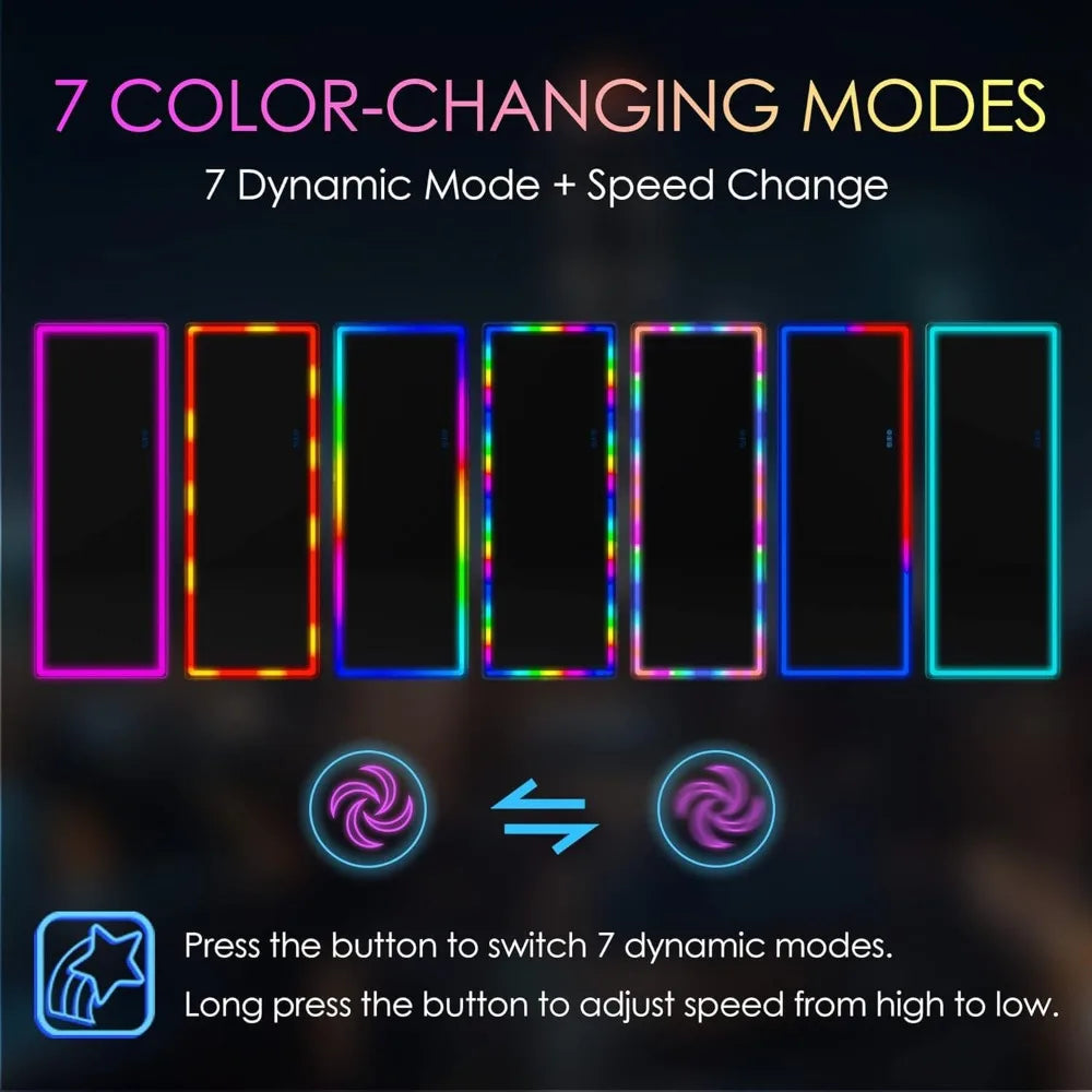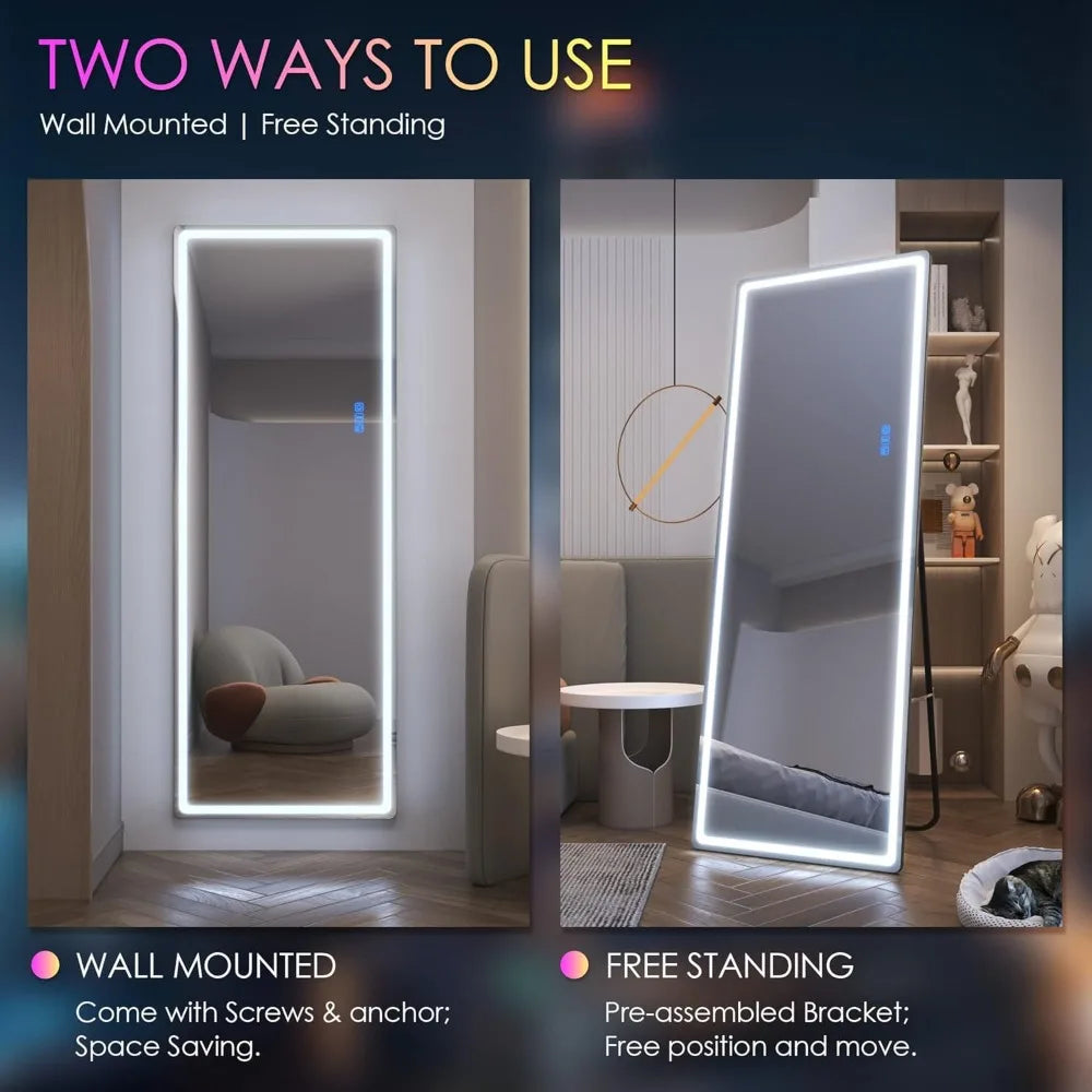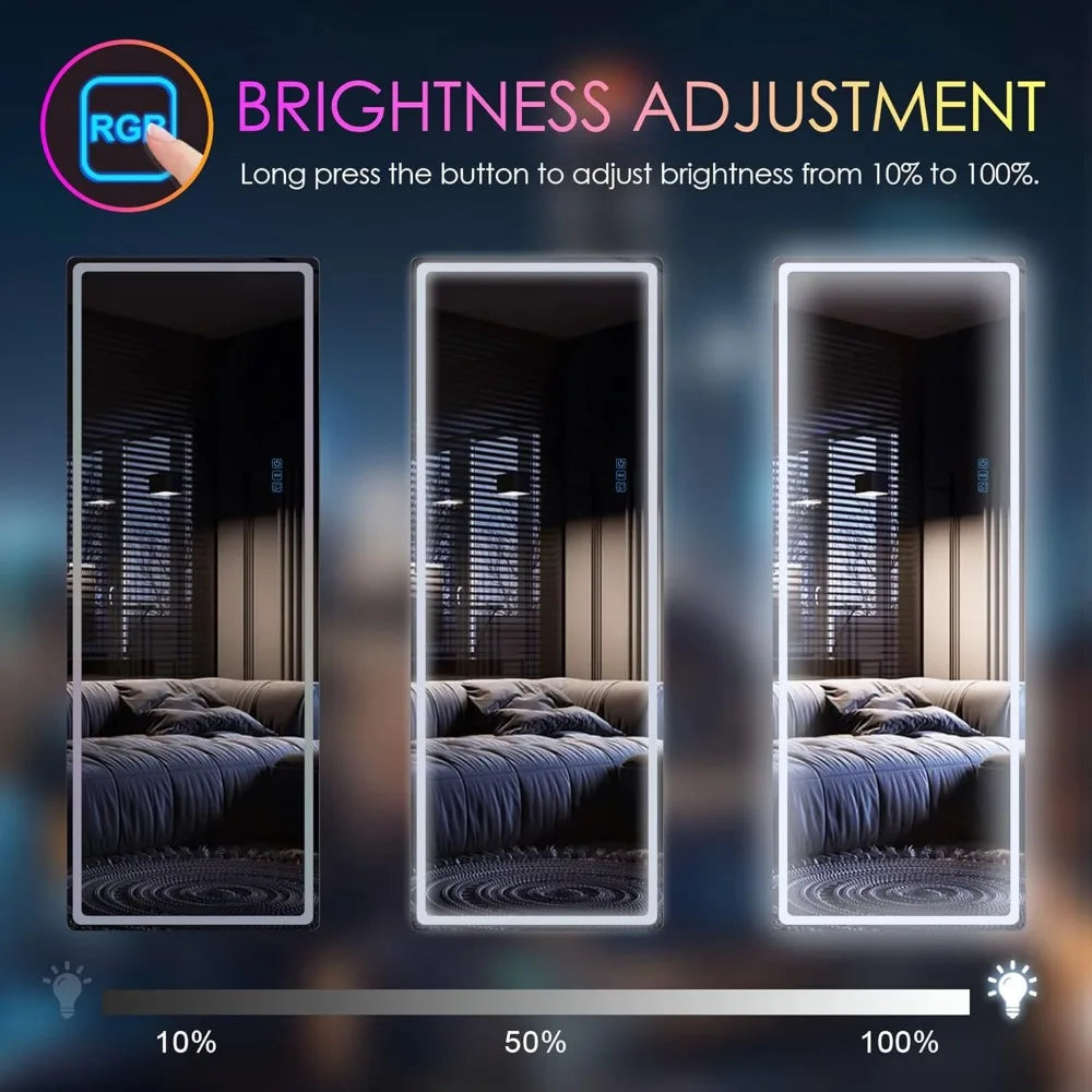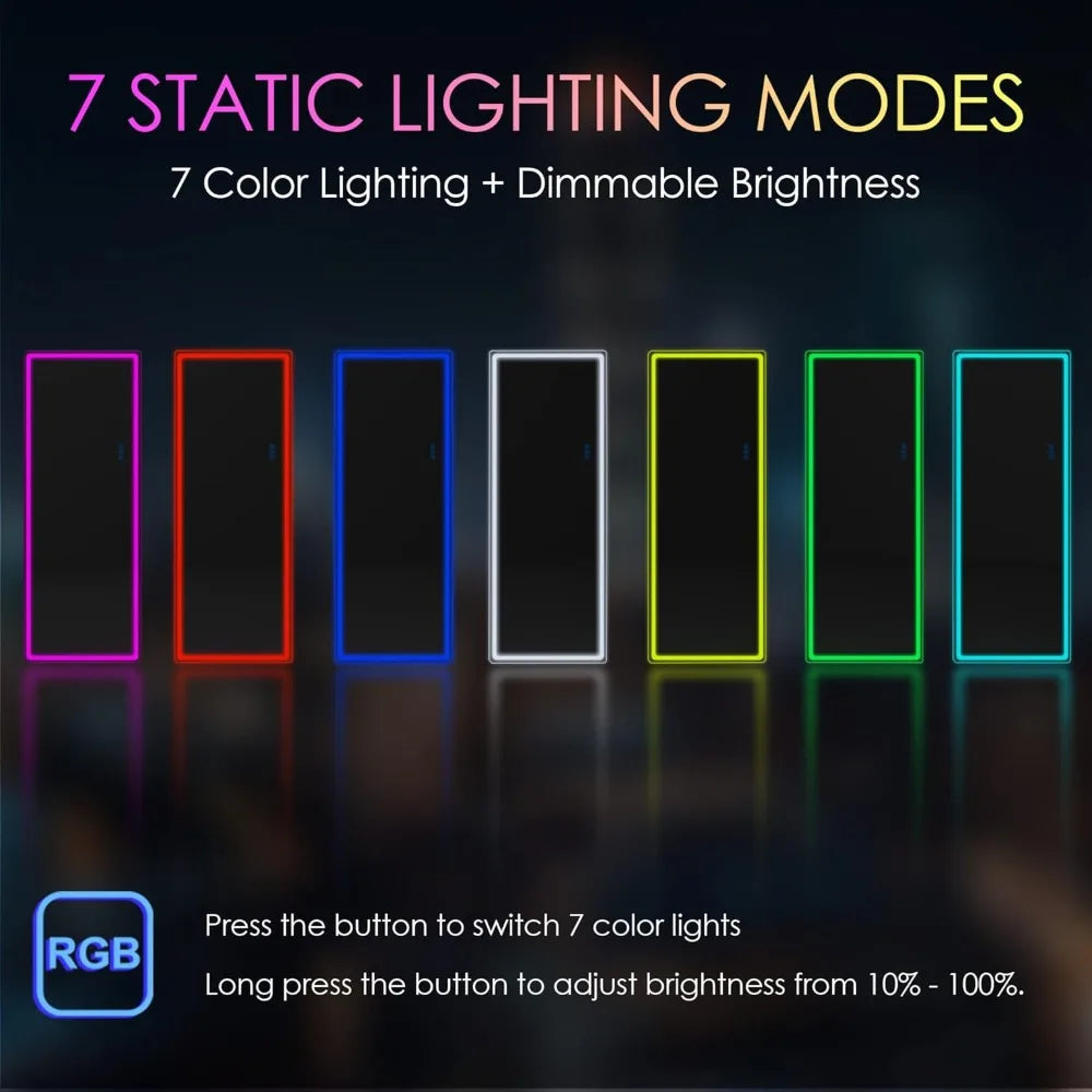 - [7 Color Lights + Dimmable Brightness] With upgraded led strip, this RGB full length mirror will add luxury to your room, light up your life, and make life more colorful and wonderful. There are 7 color lights (white, light blue, pink, red, yellow, blue, green) and you long-press the button to adjust the brightness among these colors. The memory function can keep the last brightness setting while turning on again