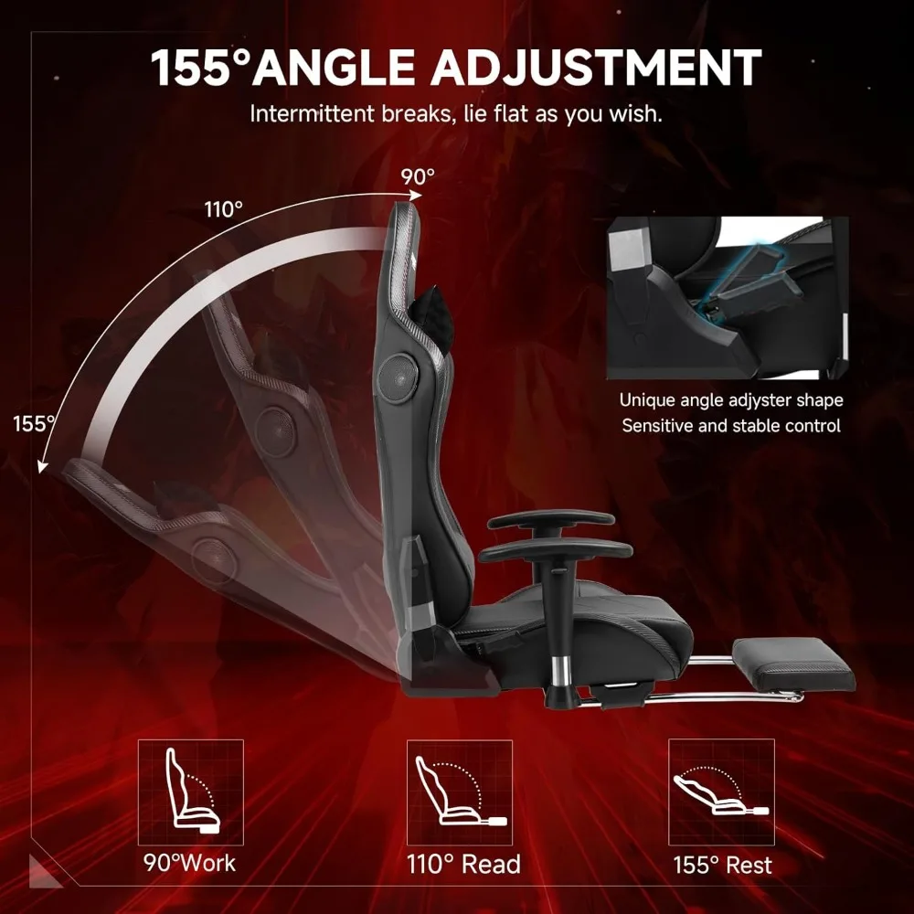 - 【Multi Function】Effortlessly switch between work,gaming and relaxation modes with the chair's adjustable reclining backrest.Tilt to 90°for focused work,110° for casual gaming or recline back to 155°for a quick nap.The smooth reclining mechanism allows easy angle adjustment,while the sturdy frame ensures stable support at any position.Whether you're deep in a competitive game or unwinding after a long day,this chair delivers exceptional comfort tailored to your needs.