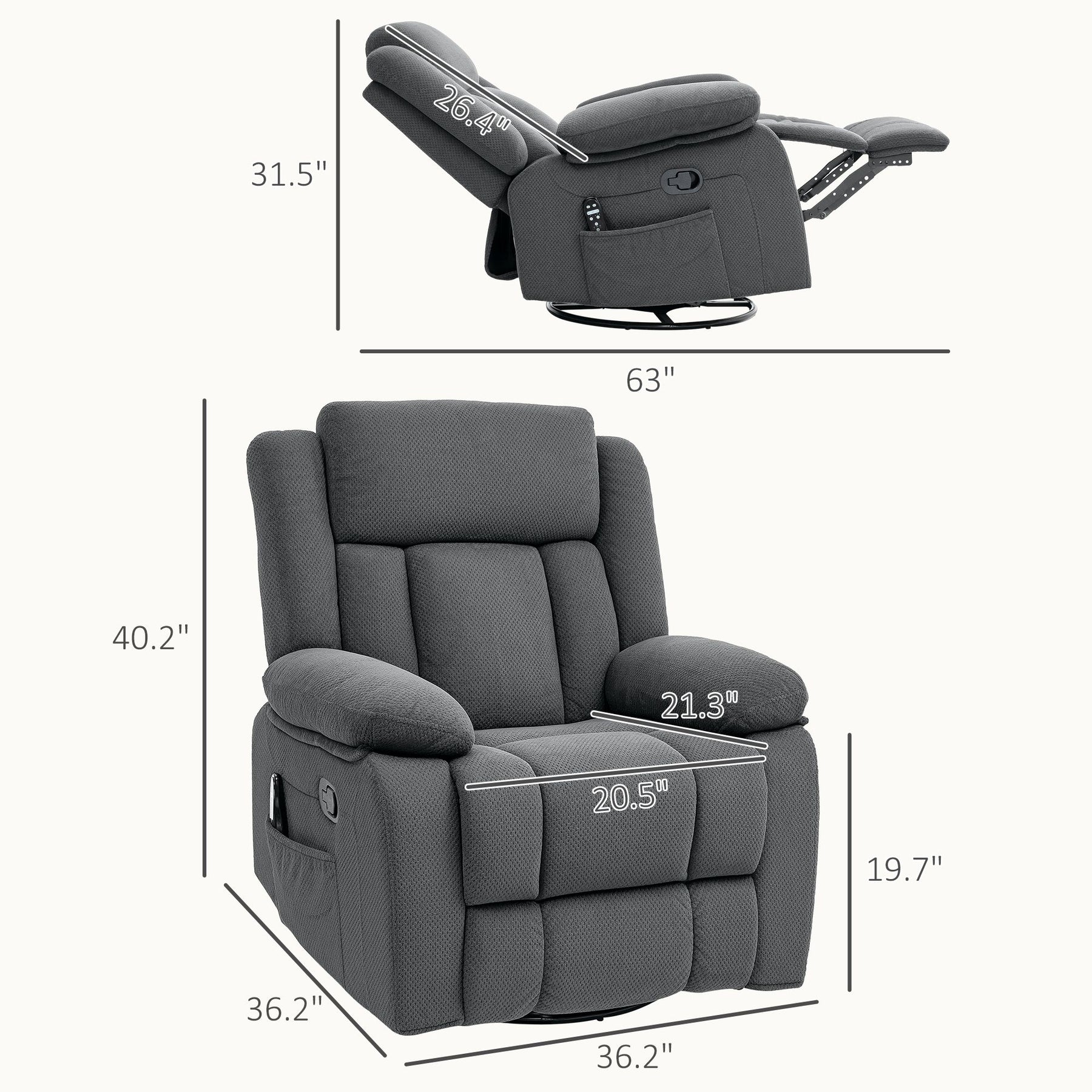 Sink into bliss with the HOMCOM massage recliner chair! Featuring eight vibrating points and lumbar heating, this reclining sofa offers personalized comfort with five massage modes controlled by a wired remote. Switch from upright to a dreamy 150-degree recline with a simple pull. Rock or swivel 360° to find your preferred relaxation angle in this plush armchair. Great for any cozy retreat!