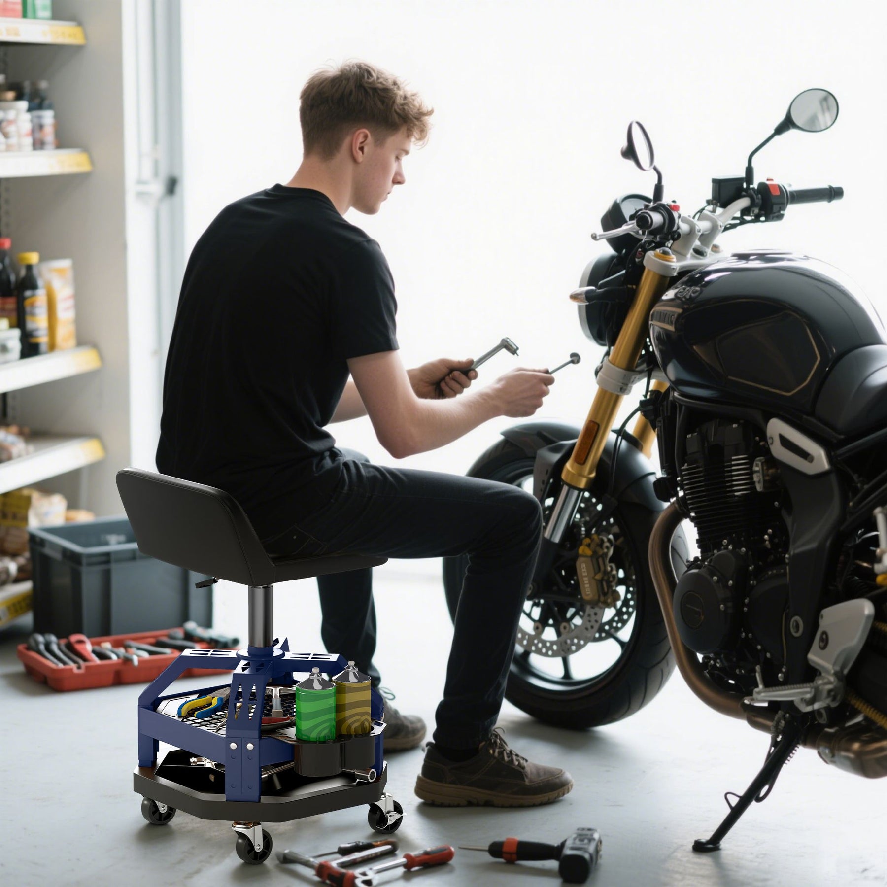 - 2-Tier Storage Tray with Bottle Holder: This garage chair features a dual-tier storage tray with a removable side bottle holder, keeping everything you need within reach, such as wrenches, screwdrivers, lubricant spray, and more