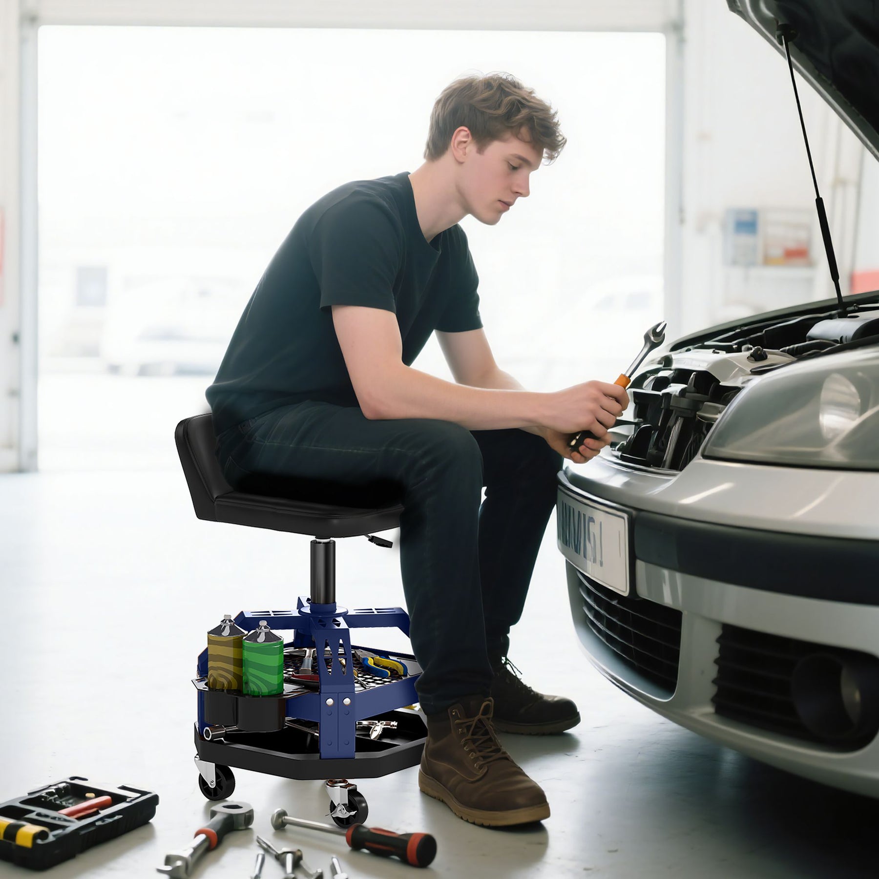 HOMCOM Rolling Creeper Garage Stool – 300 LBS Capacity with Adjustable Height & 360° Wheels Casters & Underseat Tool Tray,Blue | Mechanic Stool | Trufairs