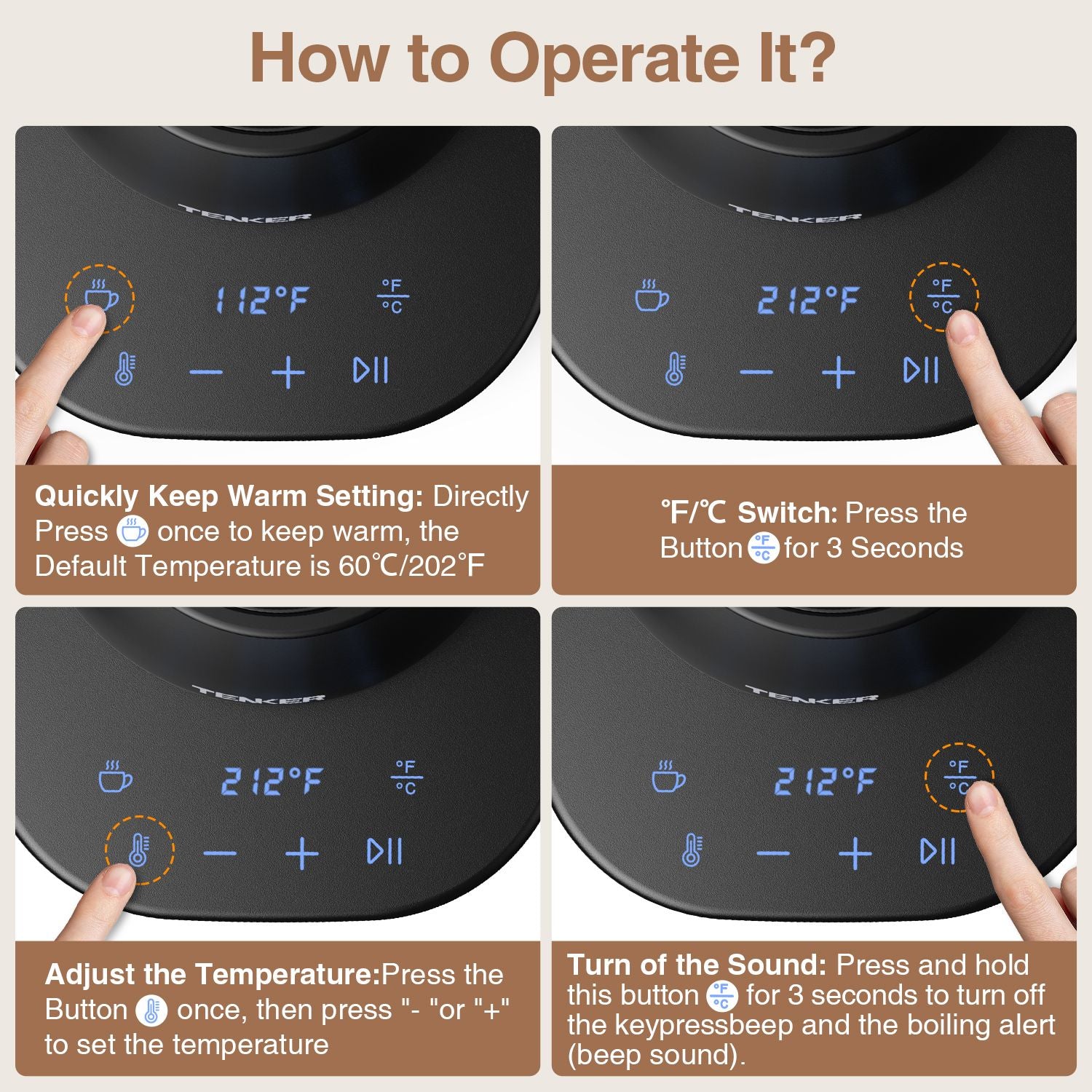 • Quick Boiling & 2 - Hour Temp Retention: Equipped with a 1300W powerful base, the TENKER electric tea kettle can bring a FULL POT of water (0.8 liters) to a boil in merely 3 minutes. Choose your desired temperature and press “Keep Warm”; the electric kettle water boiler will heat as programmed until reaching the target temperature and maintain it for up to 2 hours.