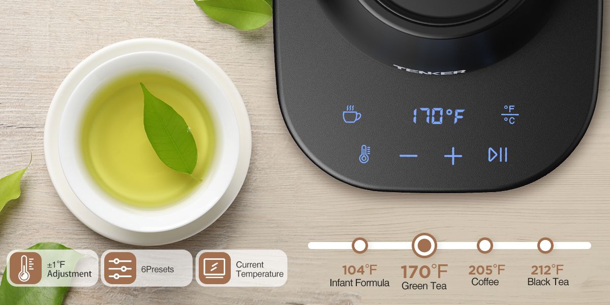 • ±1°F Temp Regulation: TENKER electric gooseneck kettle enables 1°F temperature adjustment within a broad span from 104 to 212°F. The built - in LCD panel shows real - time and target water temperatures. 5 Temperature Presets satisfy the requirements of different beverages, like Black tea, Coffee, Oolong, Green tea, White tea.