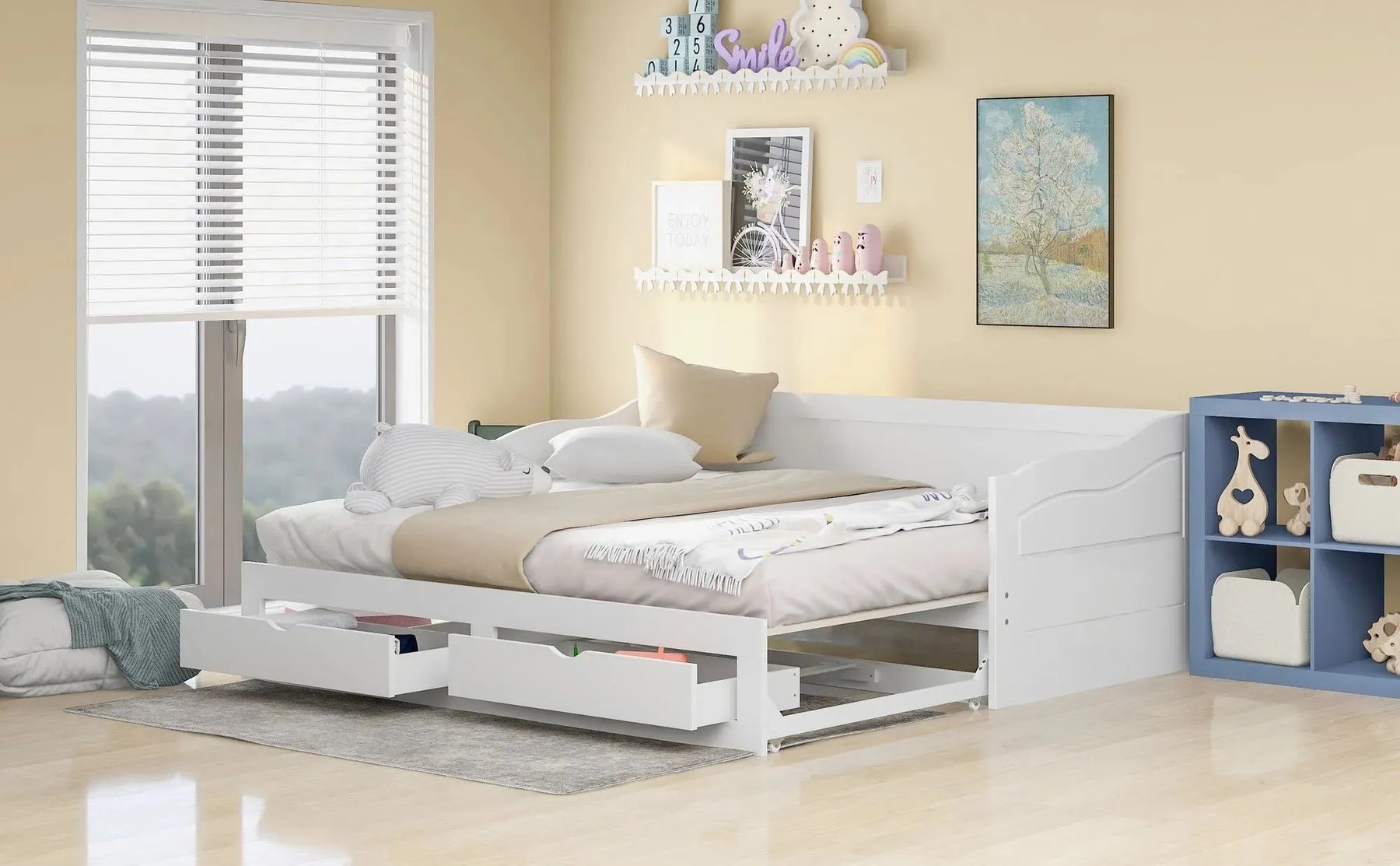 I love this daybed! It works as a cozy sofa during the day and extends into a full-size sleeping area at night. The trundle is great for guests, and the drawers are deep enough to store blankets and pillows.
