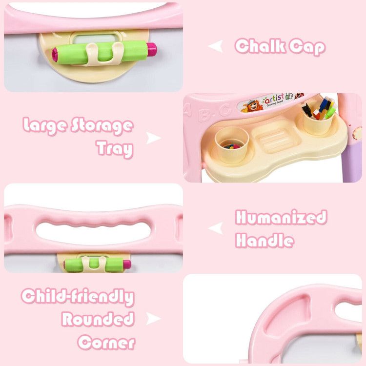 Moreover, it is equipped with 2 lengths of legs, allowing you to customize the art easel according to your child's height. The storage tray is spacious to place chalks, markers, eraser, magnetic beads, and so on. What's more, environmentally friendly PP material and stable triangle structure ensure good safety for kids to use. Detachable drawing board with a handle allows kids to carry it and draw anywhere. Cute colors will attract little artists to stimulate their imagination and create more works.