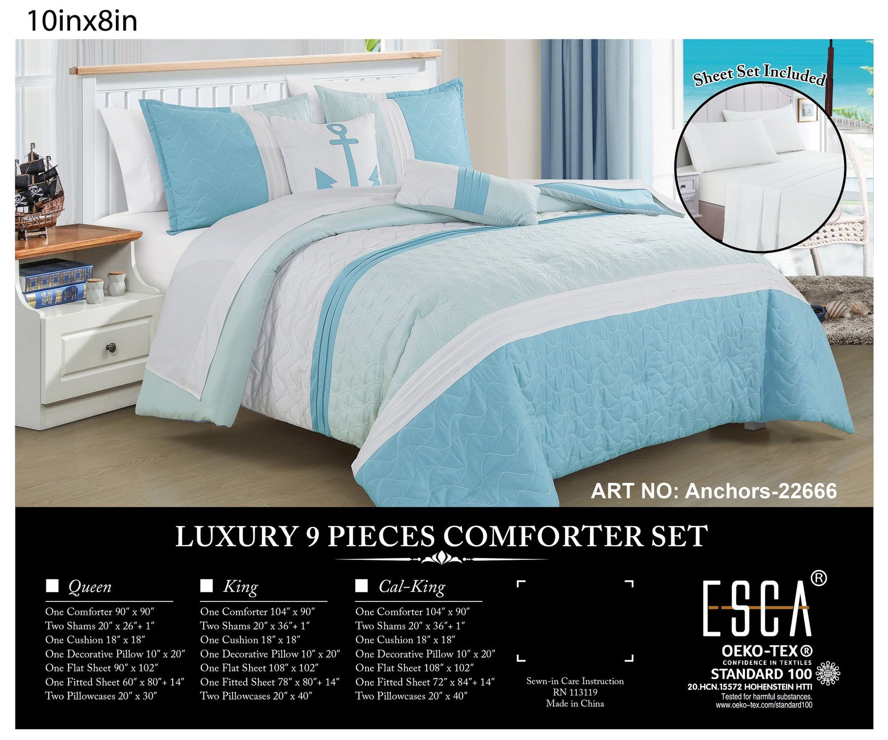 - Buy the Anchors 9‑Piece Comforter Set – Nautical Coastal Bedding Ensemble to transform your bedroom into a crisp, inviting coastal retreat. This complete set includes everything you need to style your bed: a comforter, pillow shams, pillowcases, a bed skirt, and decorative pillows — all designed around a stylish navy anchor motif for a cohesive nautical look. Perfect for beach houses, guest rooms, or everyday living, the Anchors 9‑Piece Comforter Set instantly brings charm, warmth, and sophistication to your space. Trufairs guarantees quality materials, easy online ordering, and quick delivery right to your home.